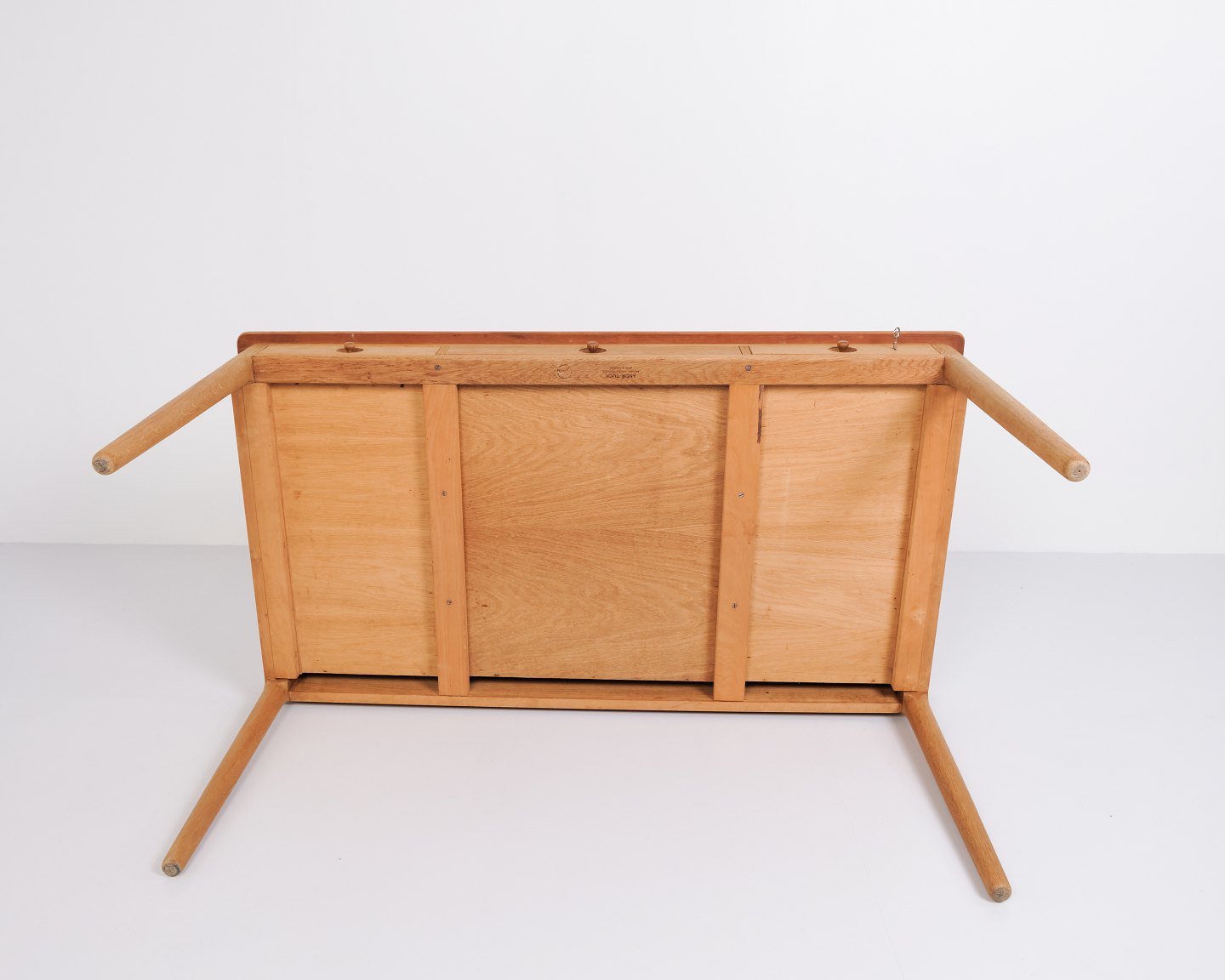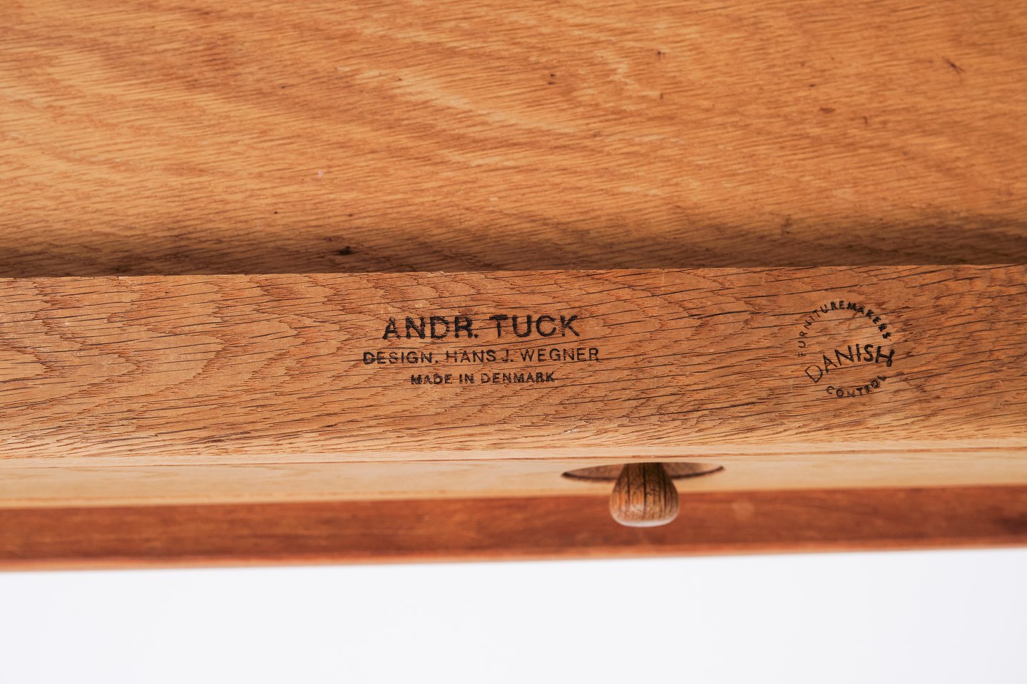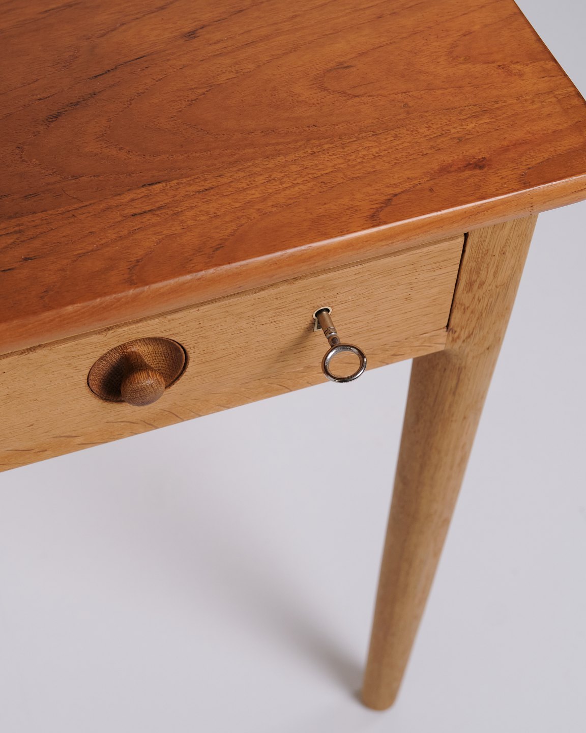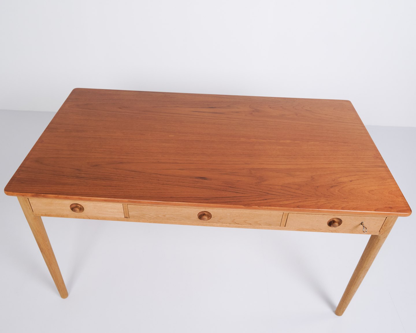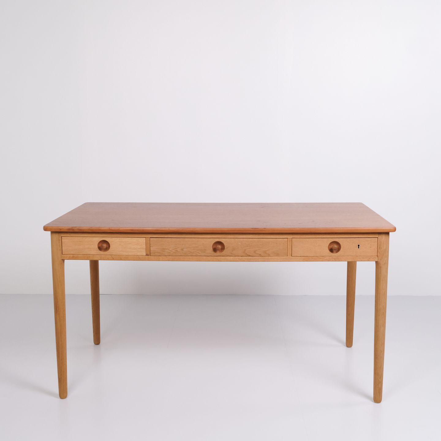 Desk designed by Hans J. Wegner and produced by Andreas Tuck in the 1960s. The table is made of teak with oak leg construction – a classic material combination that highlights Wegner’s sense of proportion and natural balance. The table has drawers in the front.