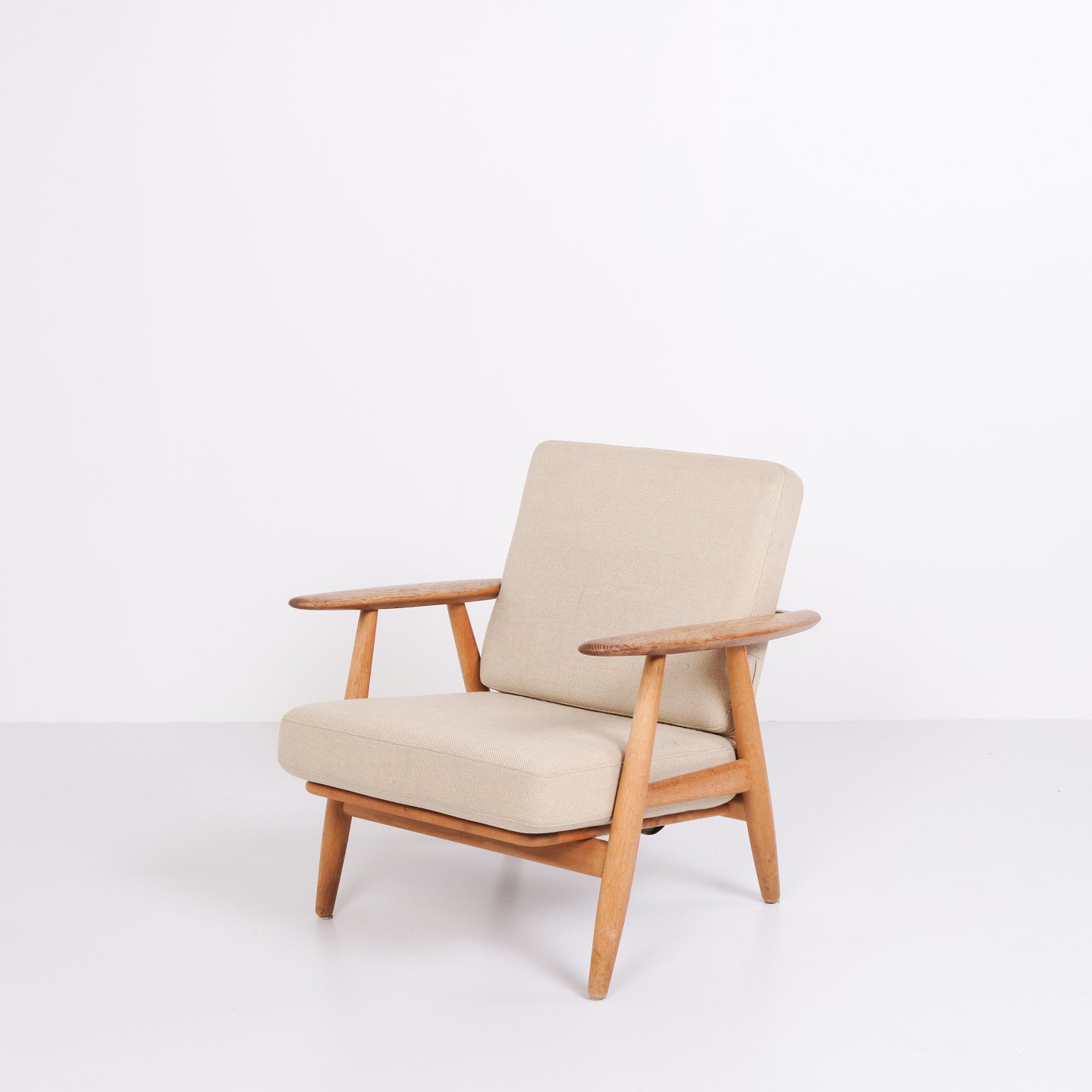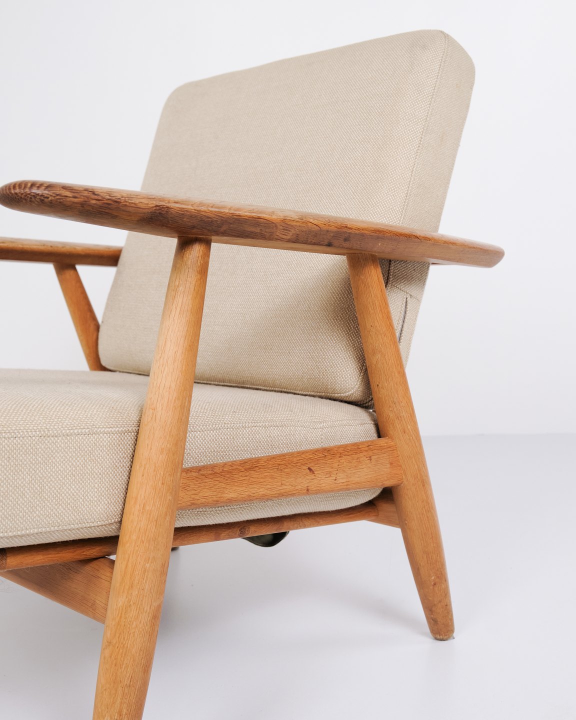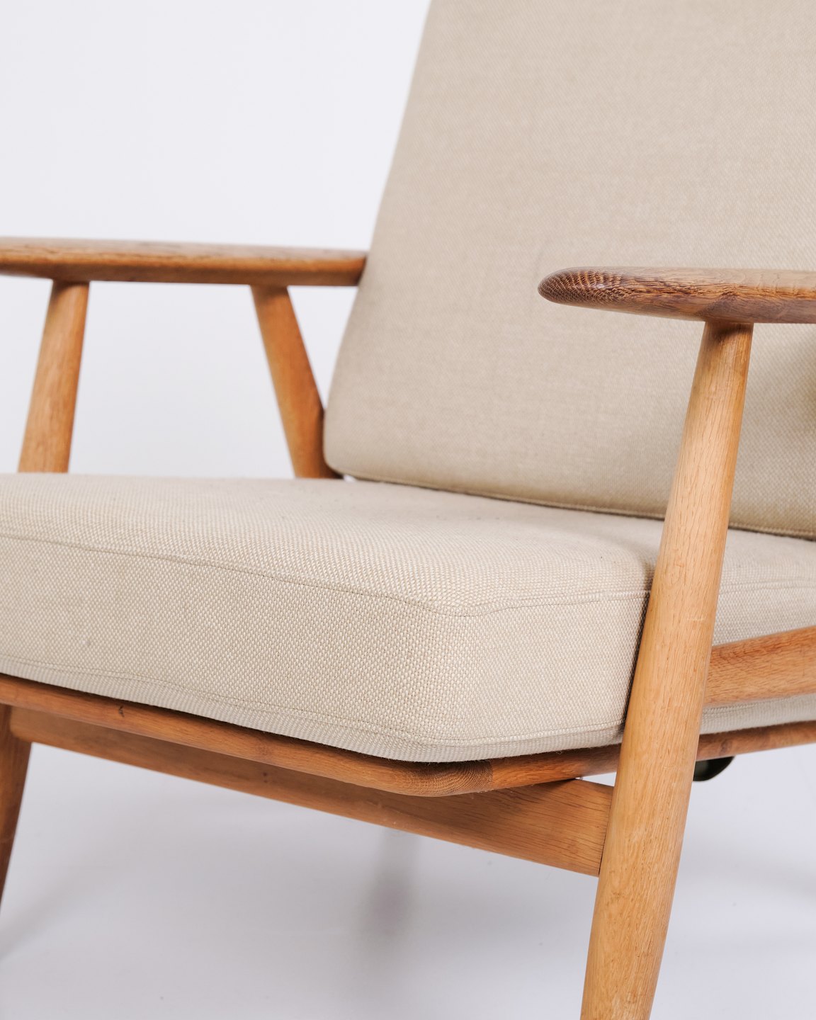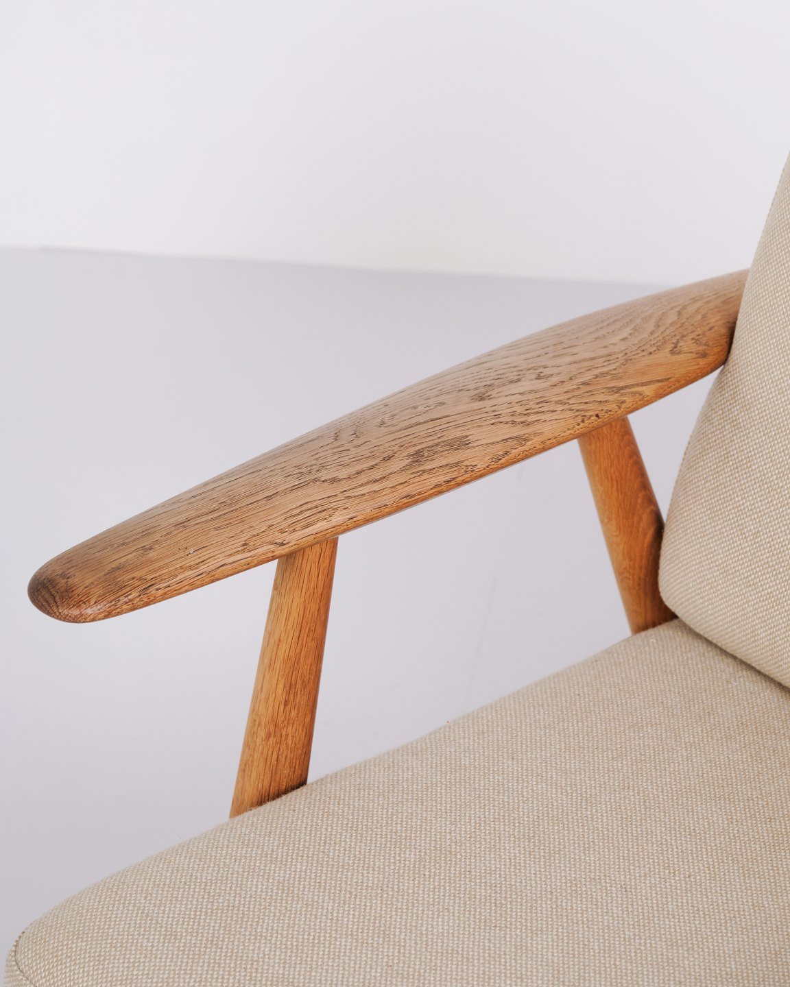 Set of two original “Cigar” armchairs, model GE 240, designed by Hans J. Wegner and manufactured by Getama in the 1960s. The chairs are made of solid oak with upholstery in light fabric.