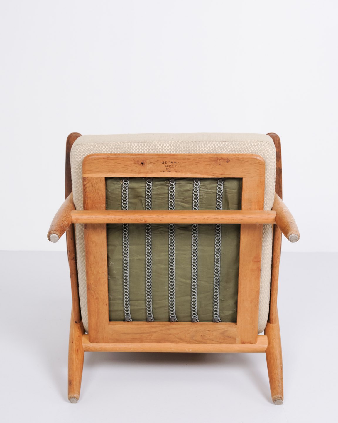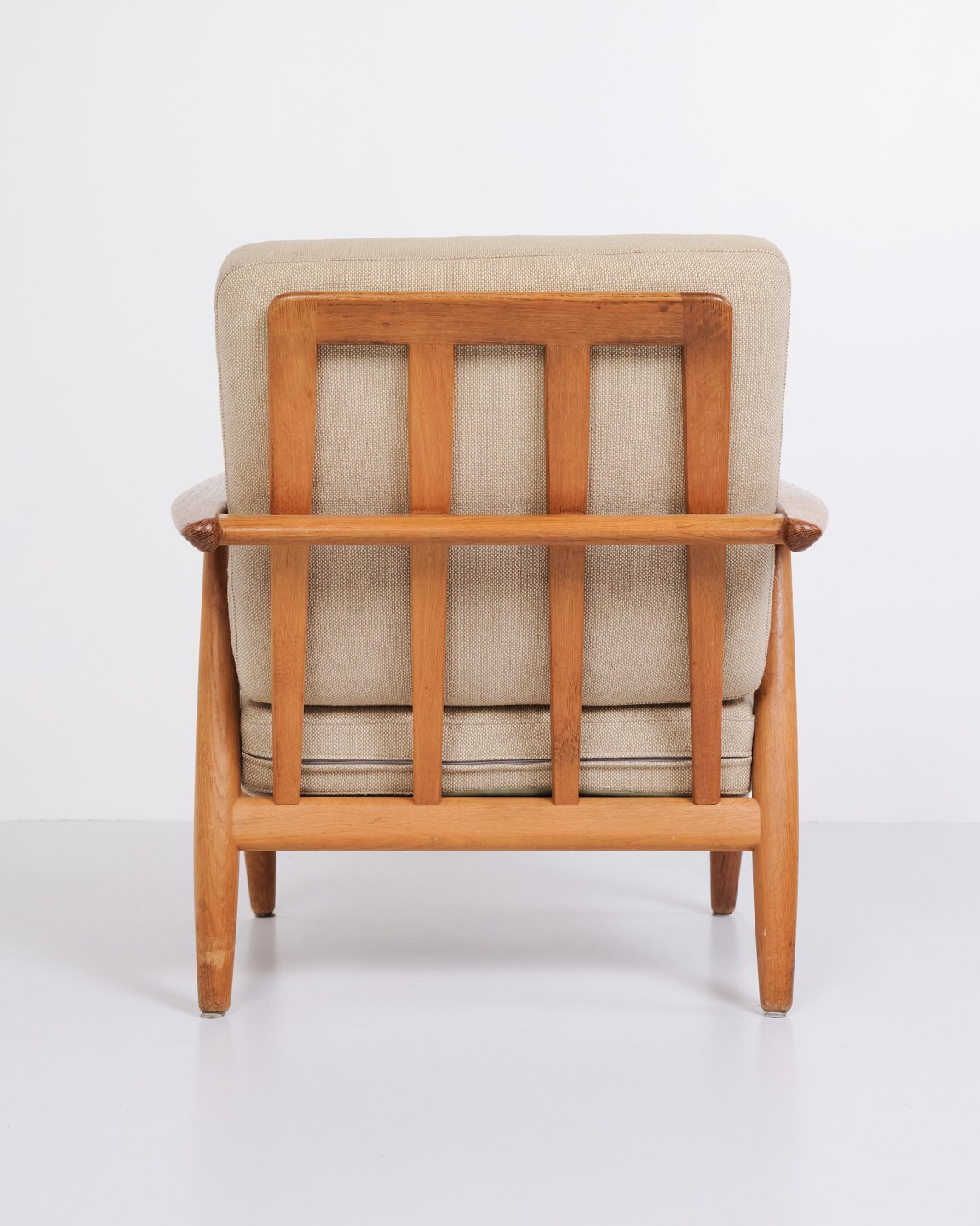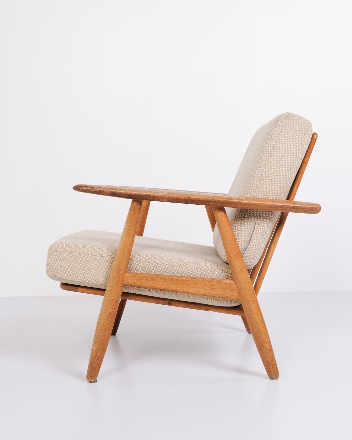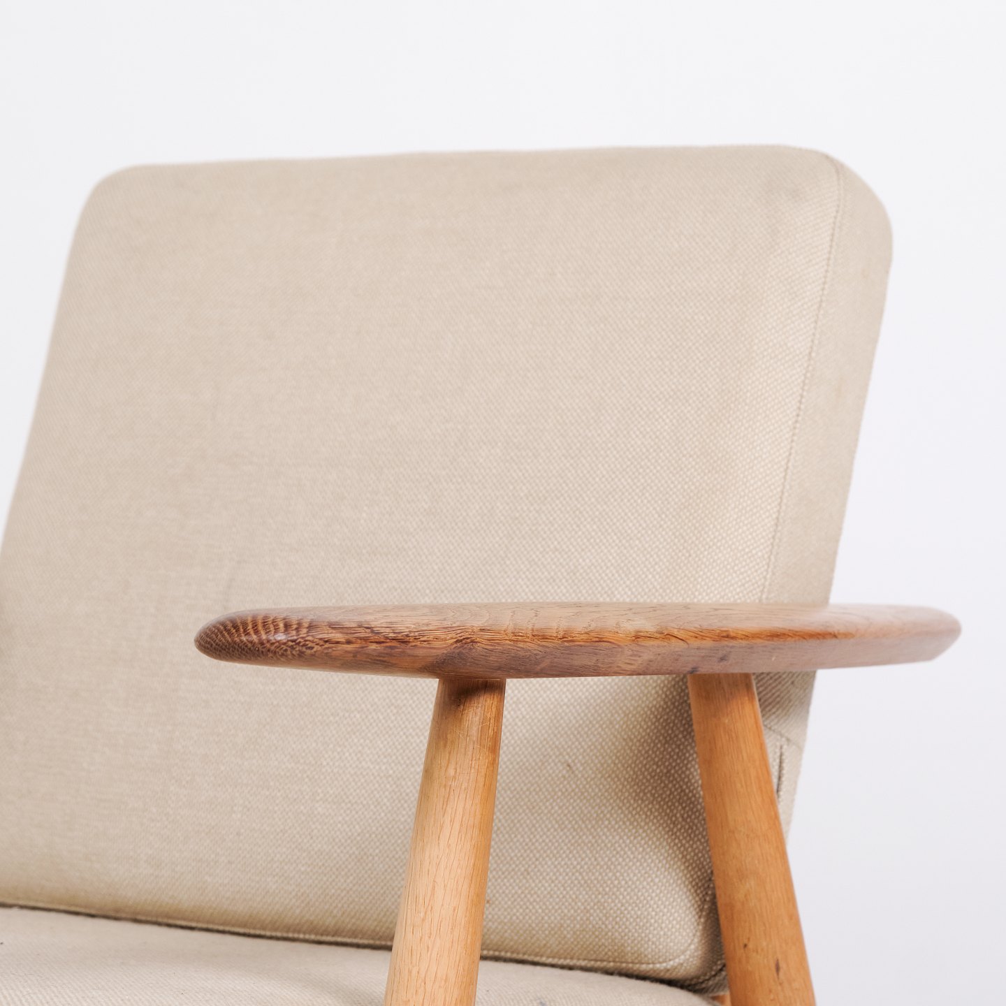 Set of two original “Cigar” armchairs, model GE 240, designed by Hans J. Wegner and manufactured by Getama in the 1960s. The chairs are made of solid oak with upholstery in light fabric.