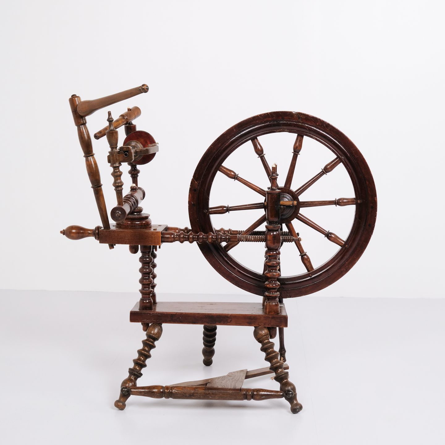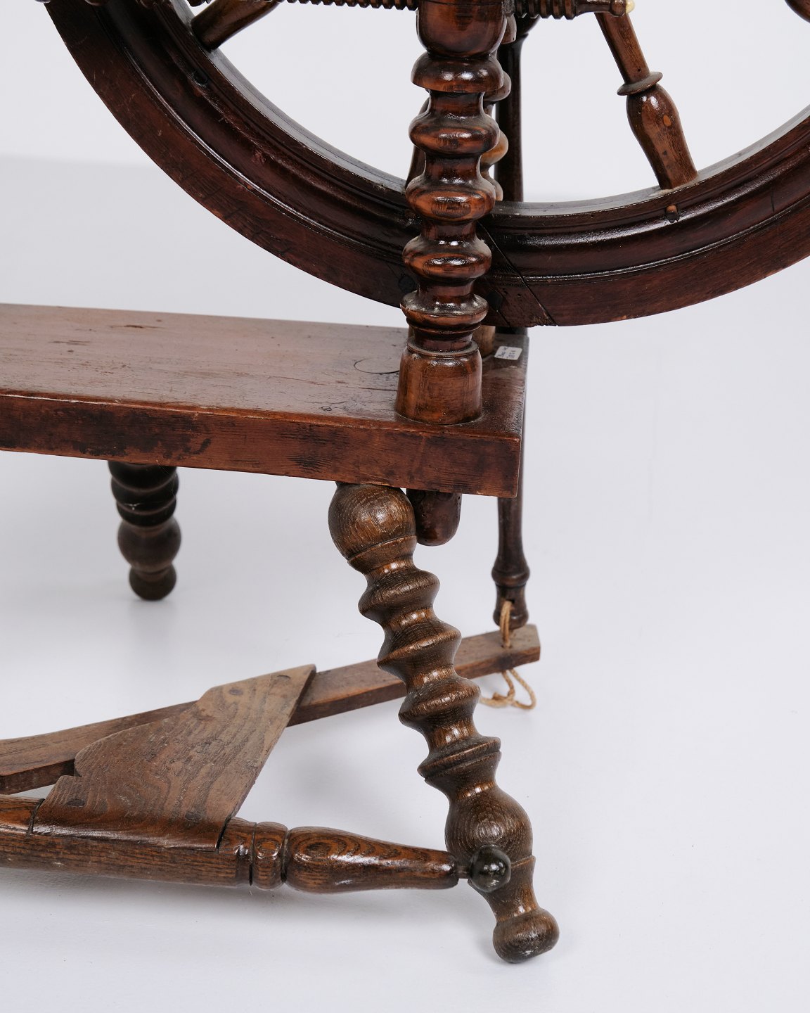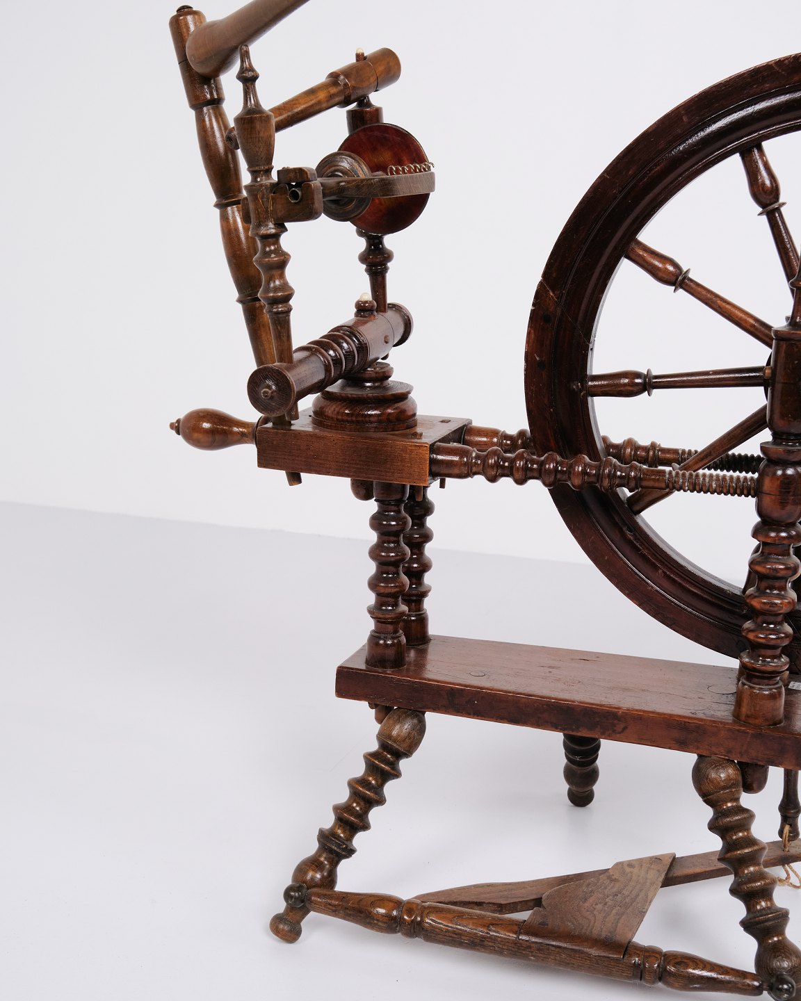 Antique spinning wheel from the 1880s in hand-polished dark wood.
