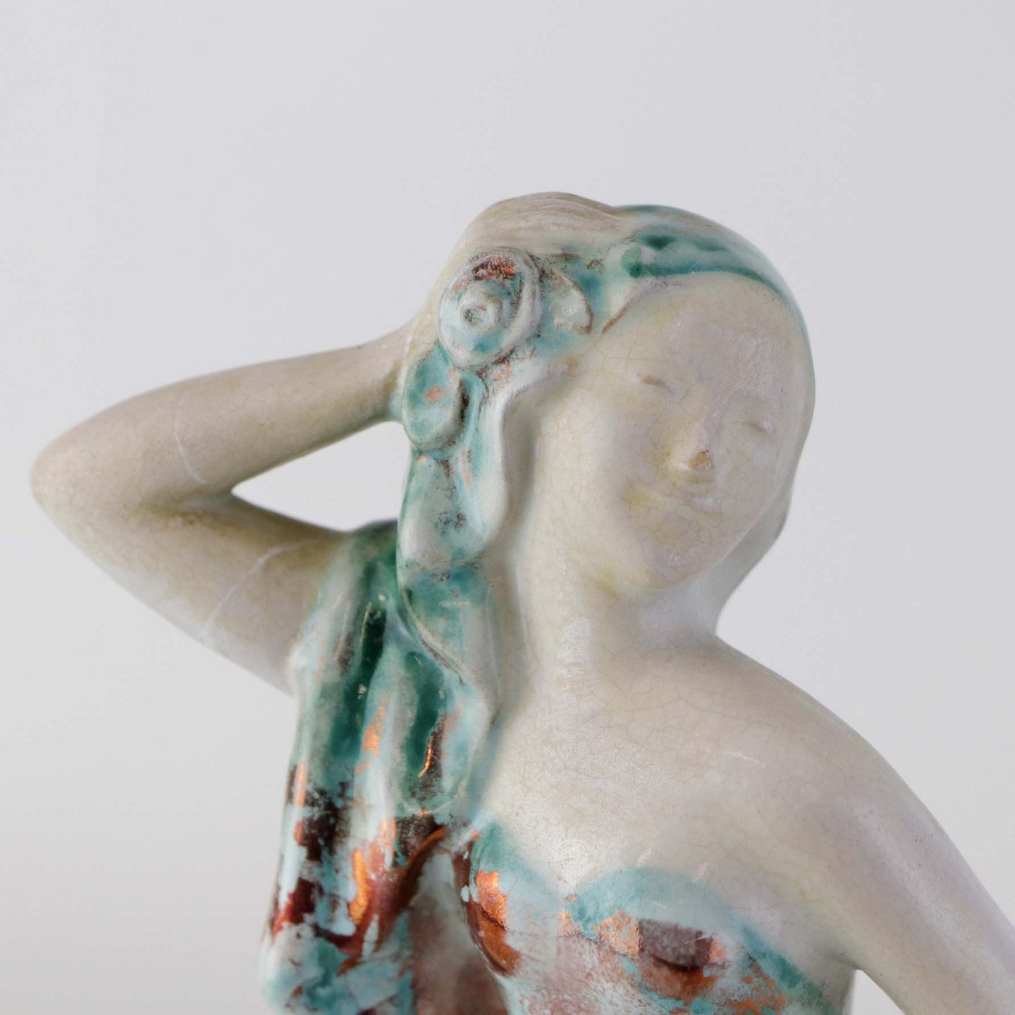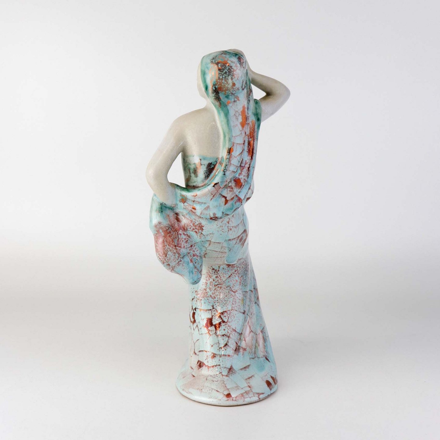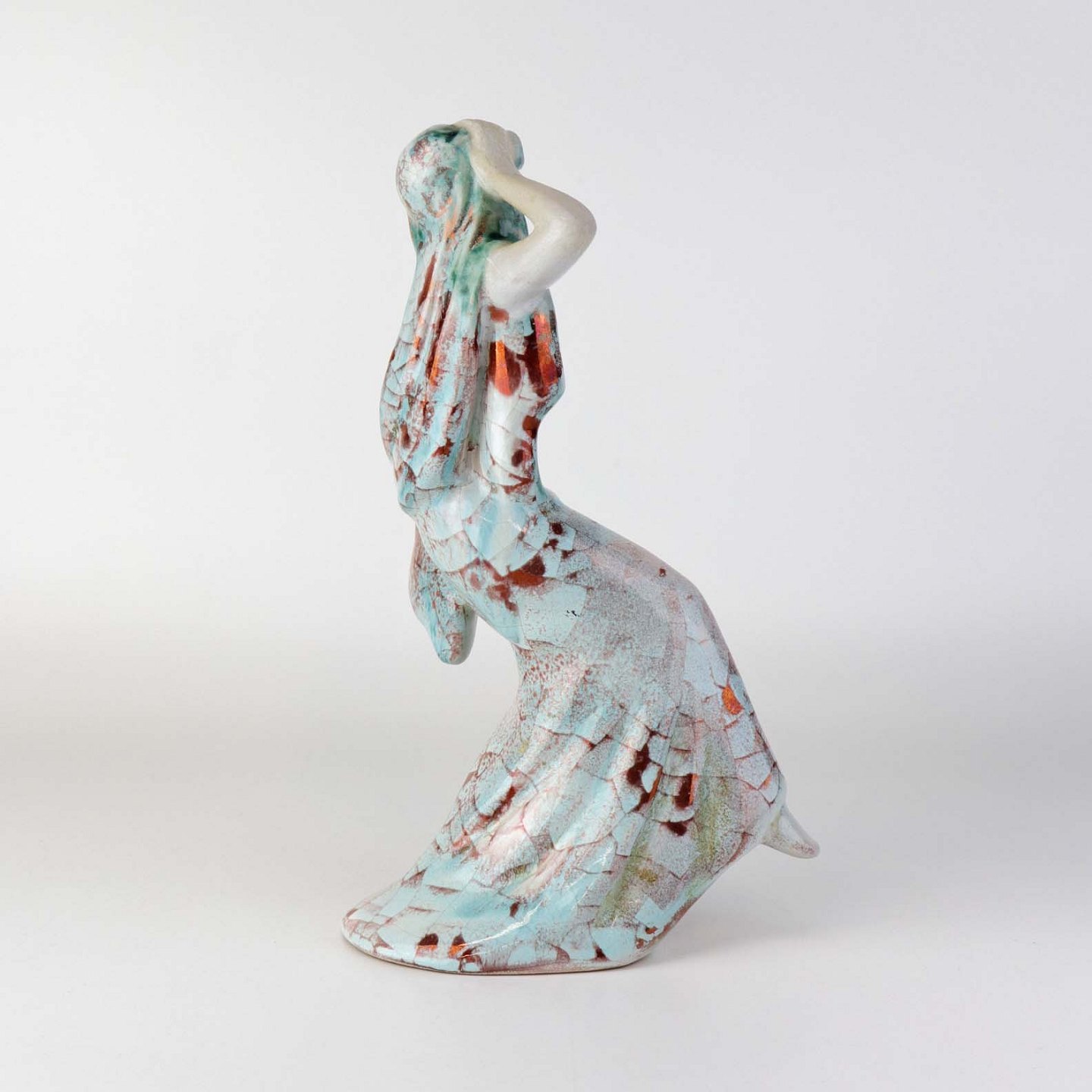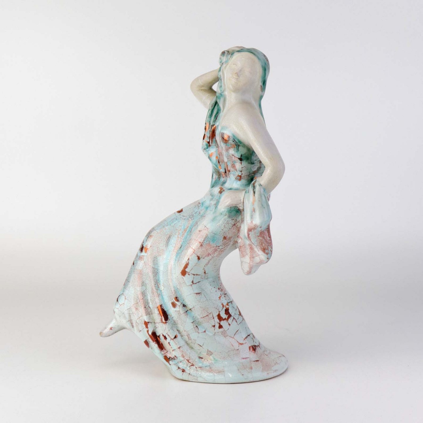Figur i keramik med motiv af en kvinde, som danser. Figuren er glaseret med krakele glasur i lyse farver. Nr. 5236-1