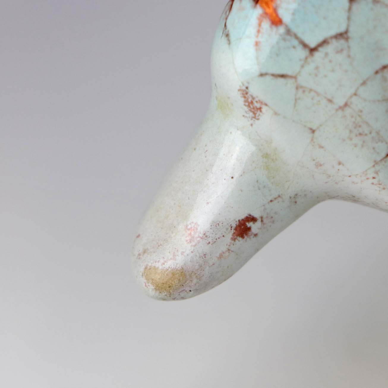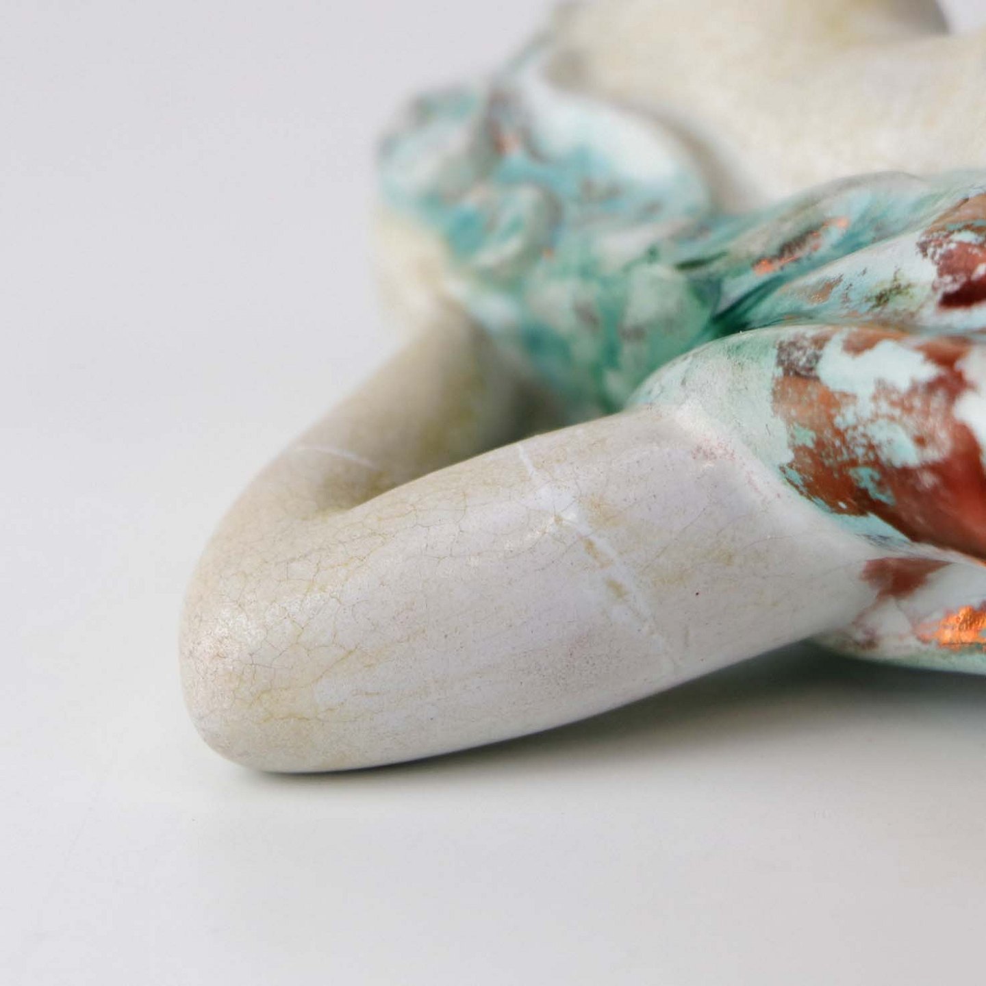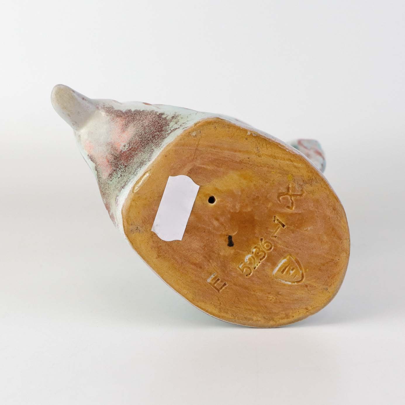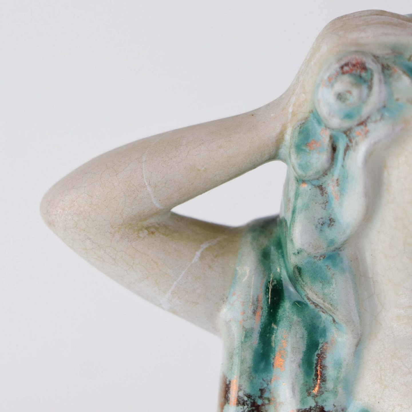 Figur i keramik med motiv af en kvinde, som danser. Figuren er glaseret med krakele glasur i lyse farver. Nr. 5236-1