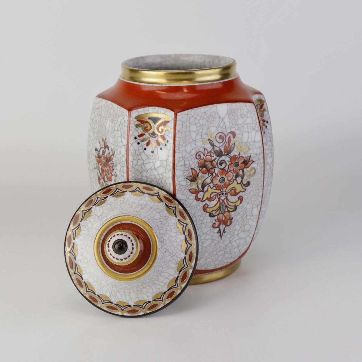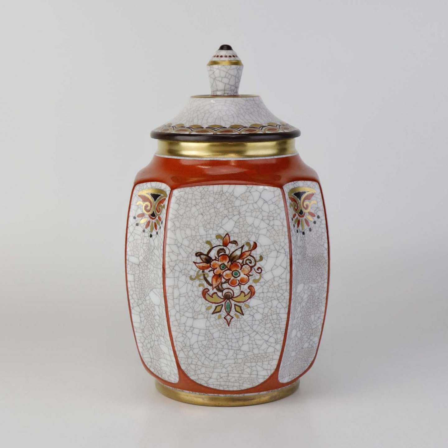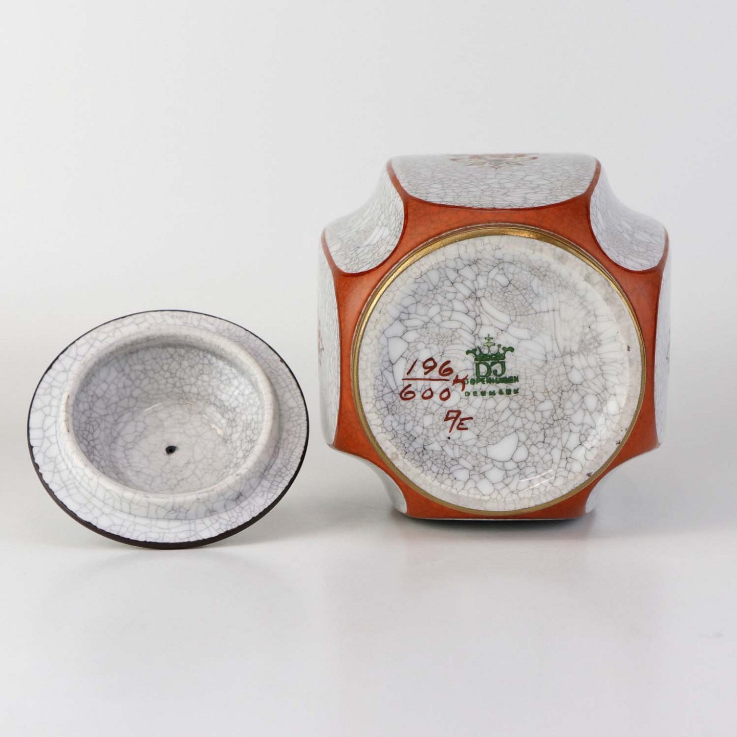 Text available in Danish: Kantet krukke med låg i porcelæn med krakele glasur og motiv af blomster samt kantet med orangerød bort og guld kant. Nr. 196/600