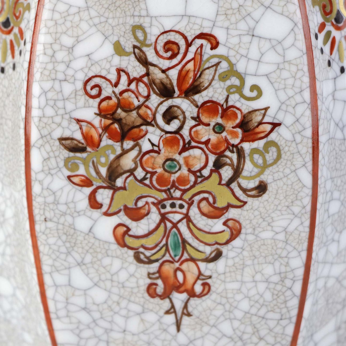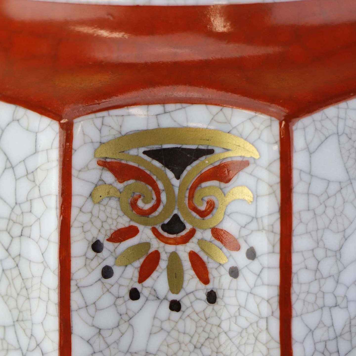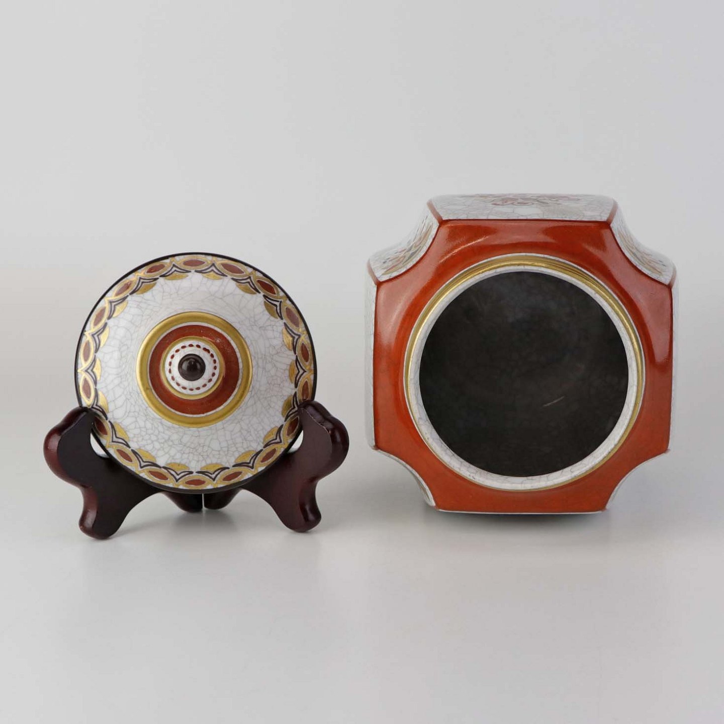 Text available in Danish: Kantet krukke med låg i porcelæn med krakele glasur og motiv af blomster samt kantet med orangerød bort og guld kant. Nr. 196/600