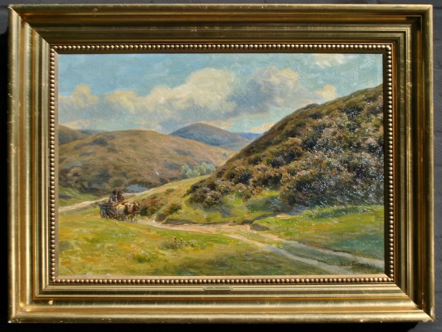 Frederiksen, Axel (1881 - 1961) Denmark: An ox-drawn cart in Rebild Bakker. Oil on canvas. Signed. 50 x 70 cm.