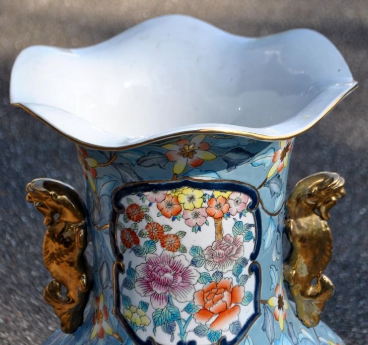 Large Chinese floor vase in porcelain, 20th century. Numerous polychrome decorations in the form of carriages with flowers, birds in flower bushes, etc. Gilded handles. Ruffled edge. Stamped. H.: 81.5 cm.