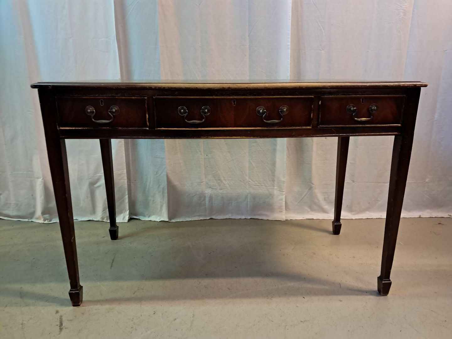 Skrivebord i fineret mahogni med læder indlæg, fra 1980erne.