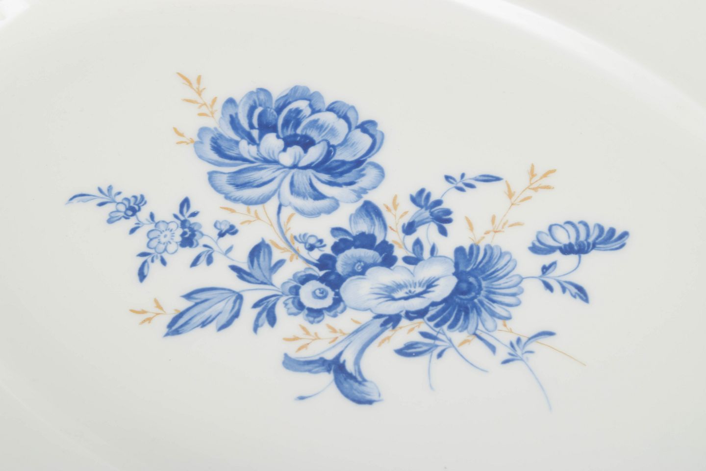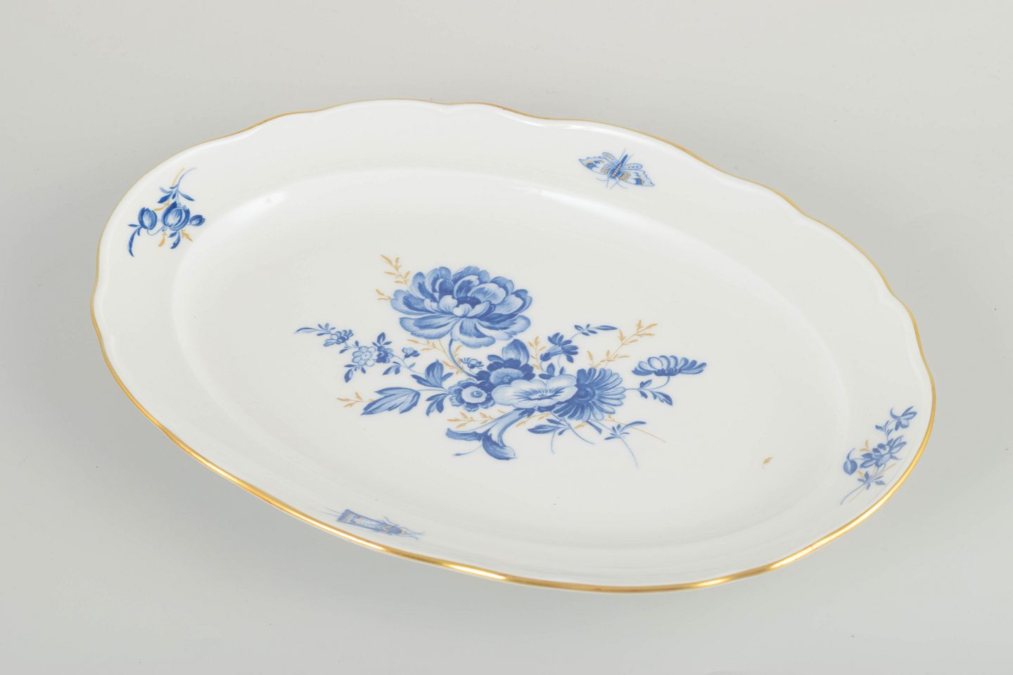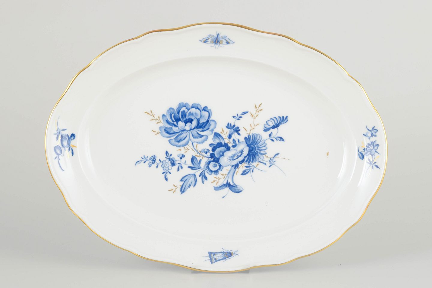 Hand-decorated porcelain with hand-painted blue floral motifs and gilt accents along the shaped rim. Classic oval form with softly raised center and finely modelled details.