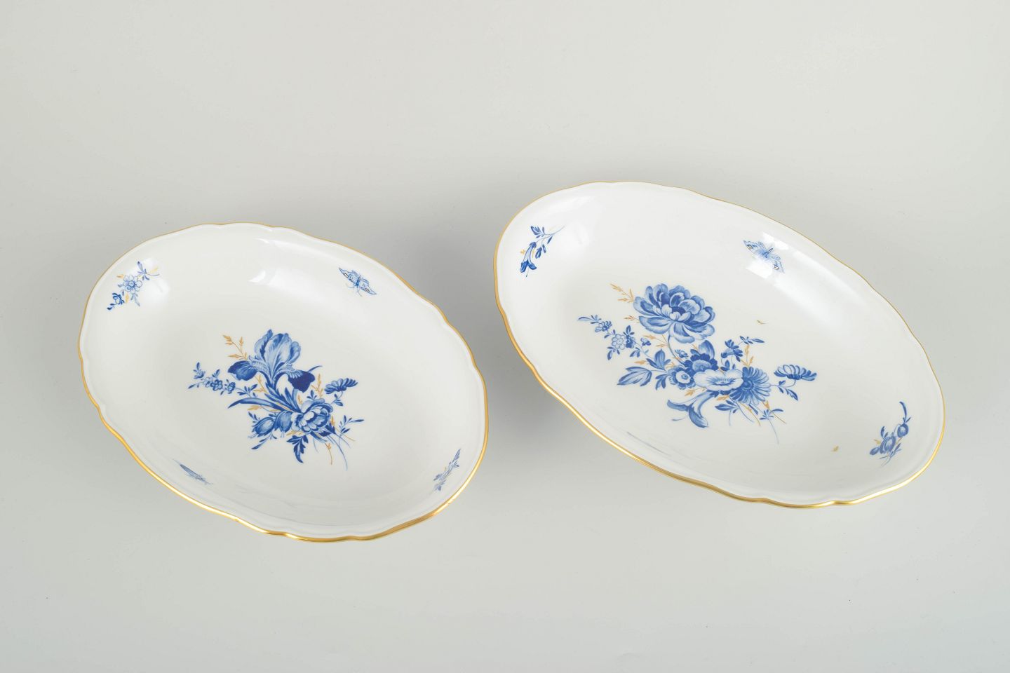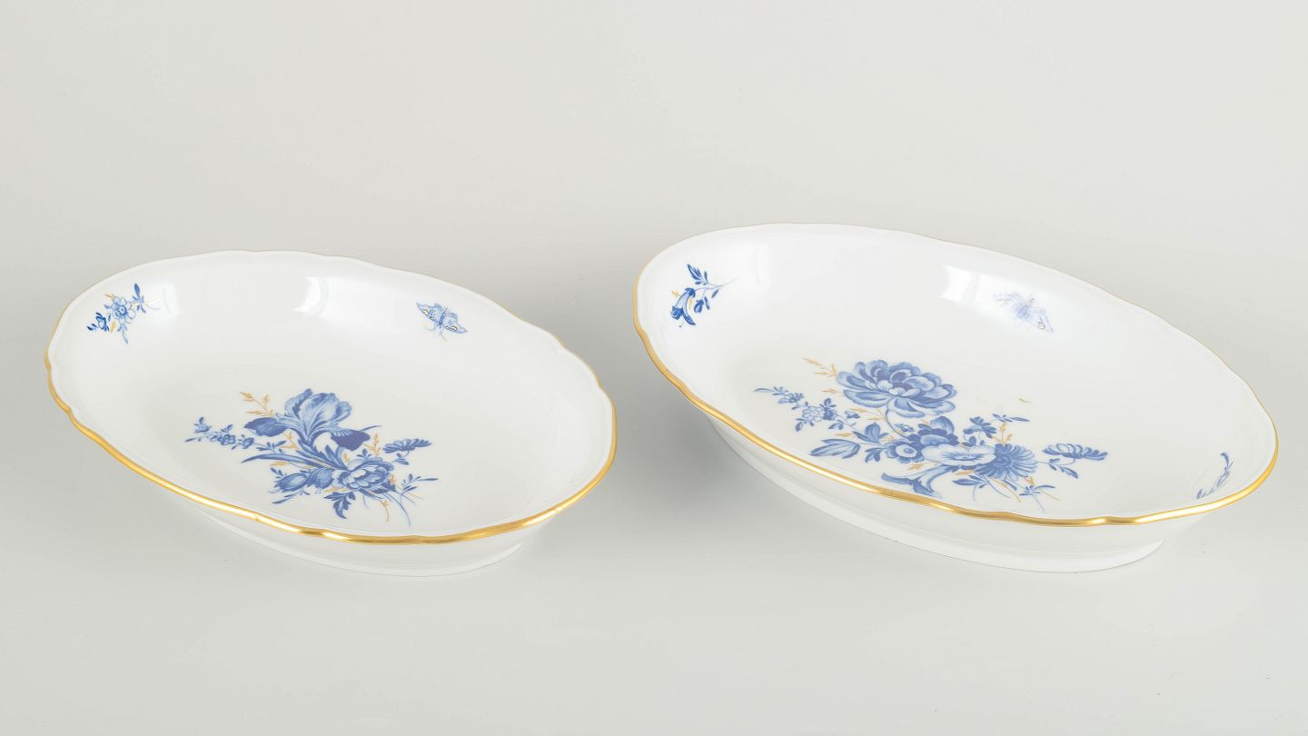 Hand-decorated porcelain with hand-painted blue floral motifs and gilt edging along the rim. Classic elegant Meissen design with gently scalloped border.