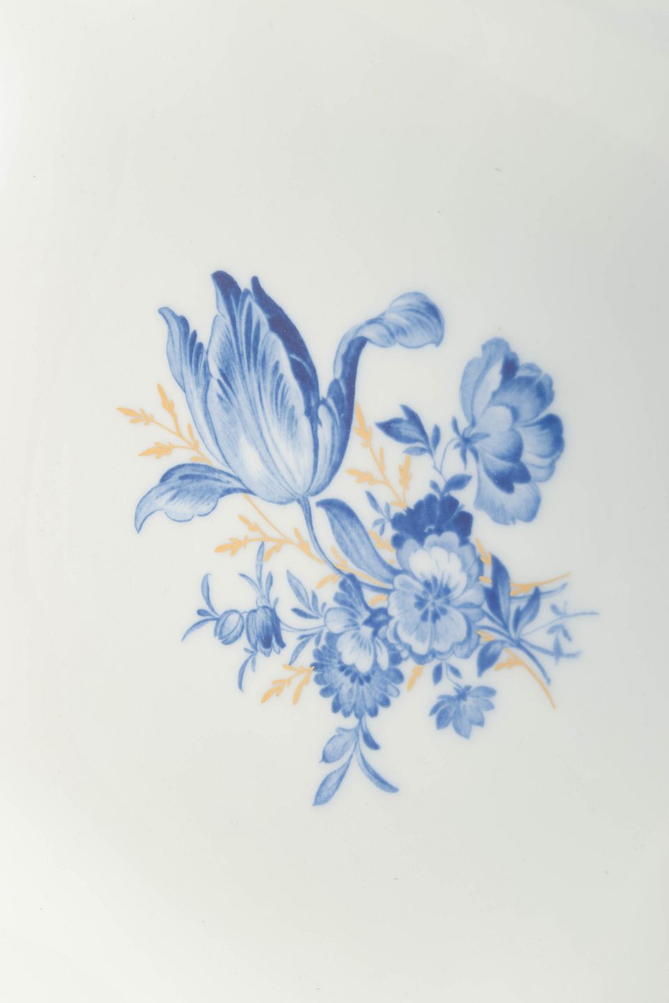 Hand-decorated porcelain with hand-painted blue floral motifs and gilt edging along the scalloped rim. Lightly asymmetrical, organic form.