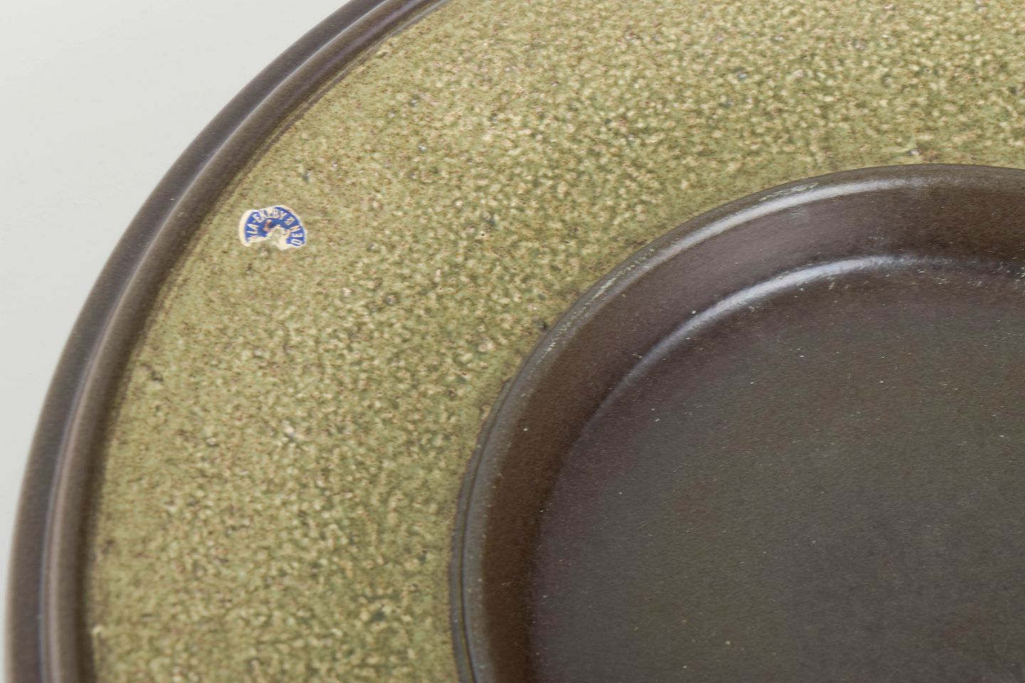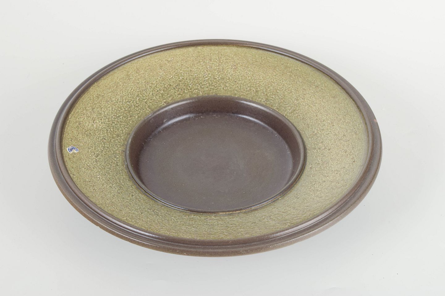 Wheel-thrown stoneware bowl with an organic form and richly textured glaze in muted green and brown tones, characteristic of Simmulson’s expressive design language of the period.