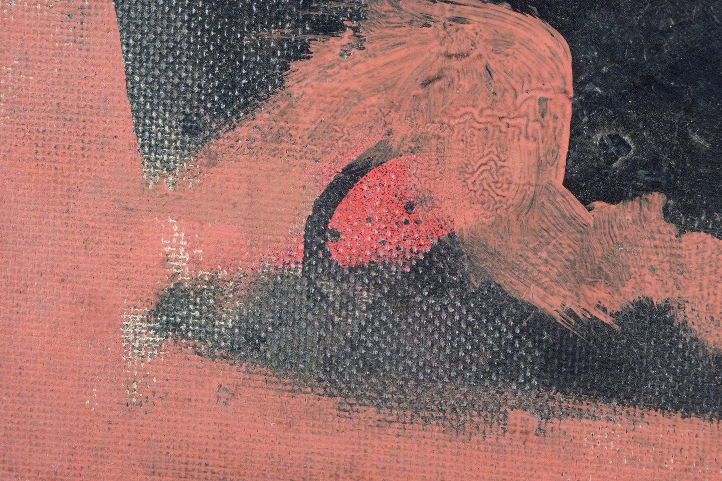 A raw and gestural abstract work featuring a dark central form against a muted pink-red ground. The paint is applied thickly with tactile palette-knife texture, giving the surface a physical and expressive presence. The tension between the black mass and the surrounding color creates a mysterious and emotionally charged atmosphere.