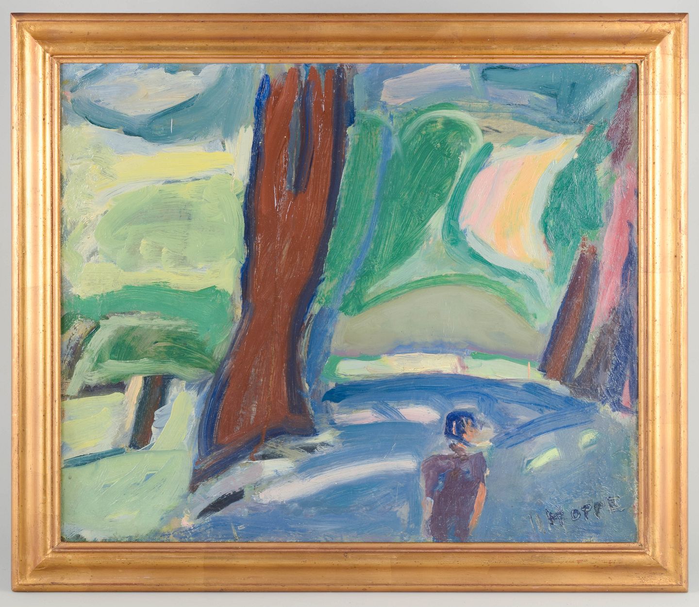 A poetic modernist landscape from Søndermarken rendered in Hoppe’s characteristic colourist style with broad, impasto brushstrokes and simplified organic forms. The composition balances between naturalism and abstraction — with the human figure quietly absorbed into a lyrical blue-green atmosphere.
