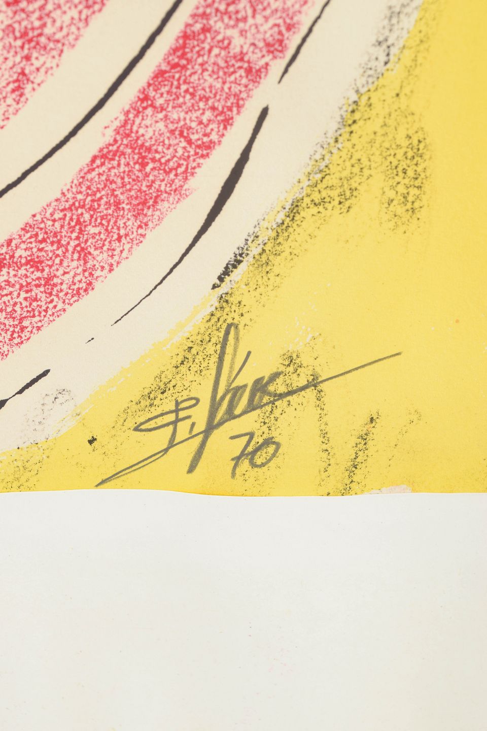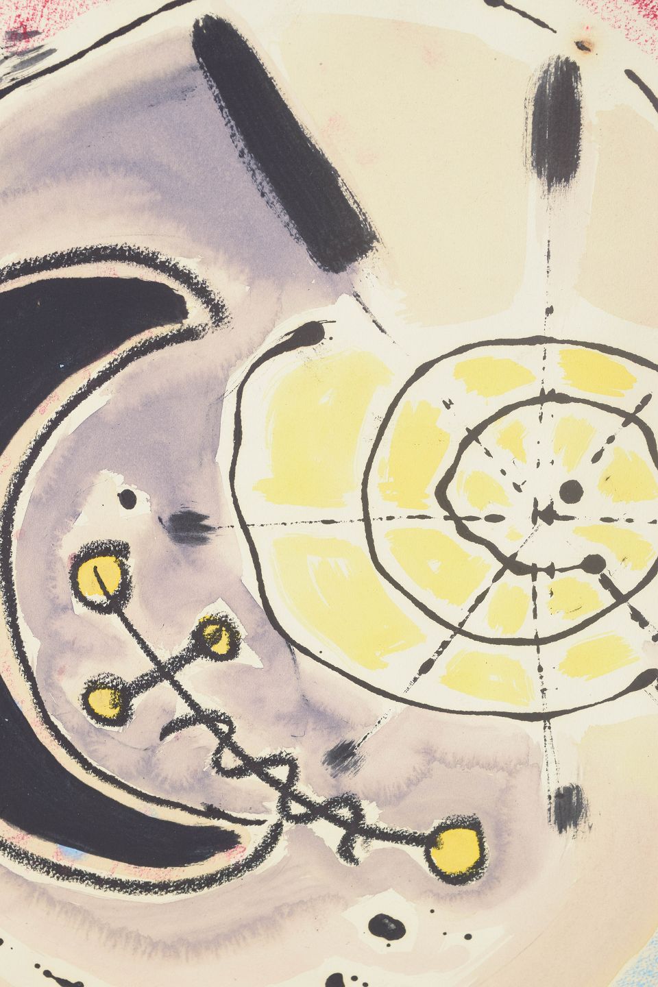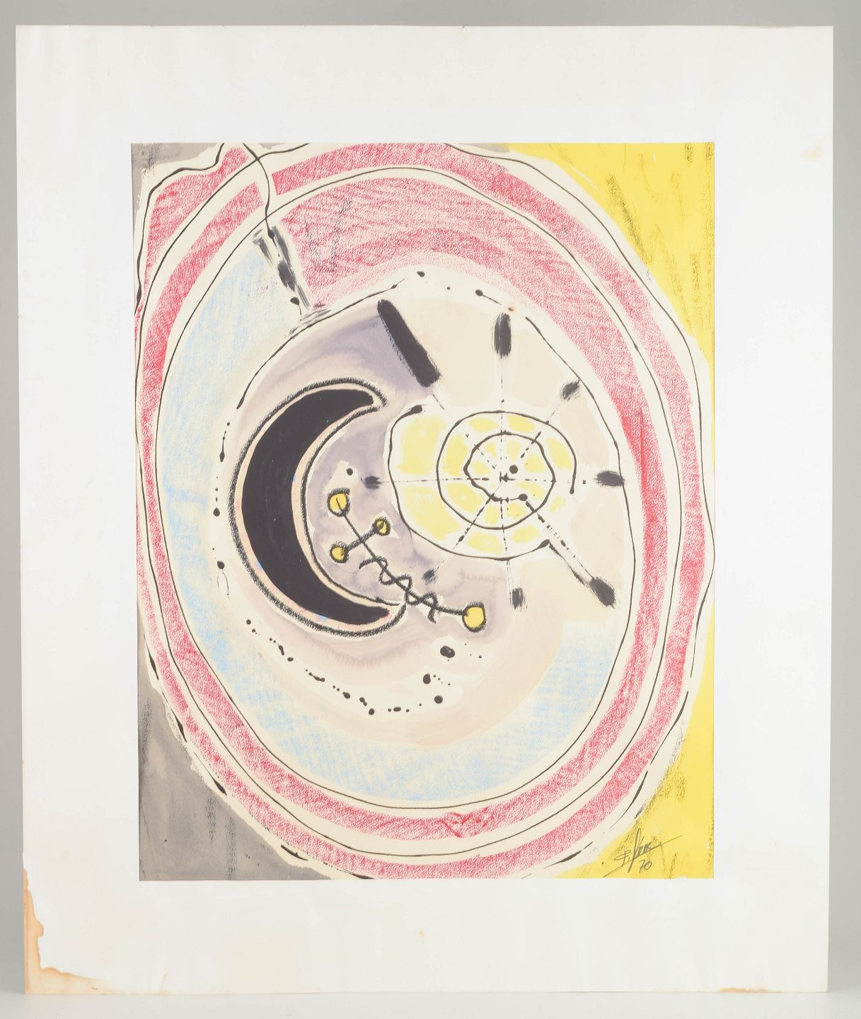 An abstract and cosmic composition with organic, spiral-like movements in red, yellow and blue tones, centred around a circular field with sun- and moon-like forms. The work balances between the poetic and the symbolic, marked by graphic rhythm and hand-drawn energy.