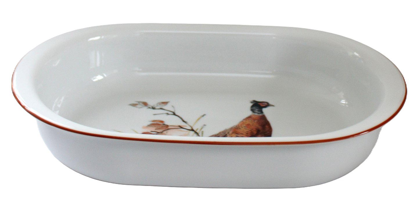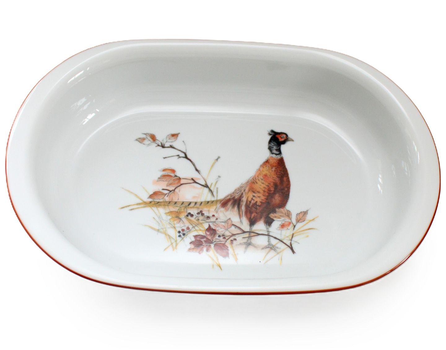 Mads Stage, Jagtstellet designet af Mads Stage for Imerco. Dybt ovalt fad med Fasan kok. Højde 6 cm. Længde 30 cm. Bredde 19,5 cm. Der er ingen mærke i bund. Pris: 625 kr. Lager: 1