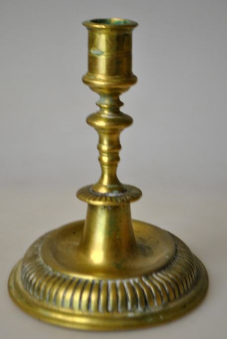 English baroque candlestick in brass, 18th century. On oval base with flutes. Turned stem. H.: 13 cm. Length base: 12 cm.