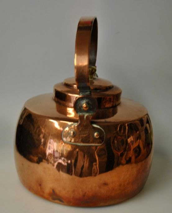 Danish antique copper kettle, 19th century. With handle and spout. With brass knob. Unstamped. H.: 18 cm. Dia.: Dia.: 20 cm. Height at handle: 26 cm.