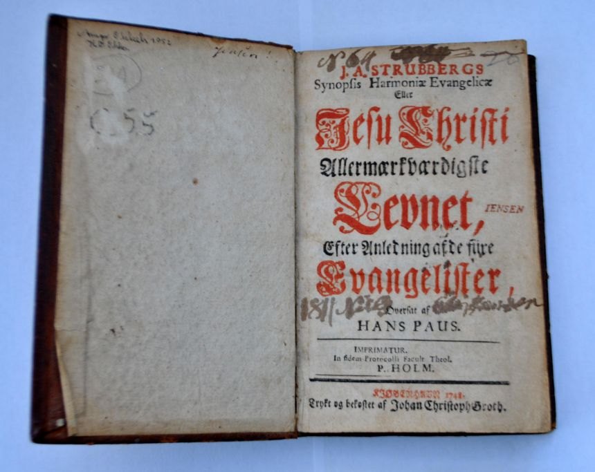J.A Strubbergs: The Most Remarkable Life of Jesus Christ, Based on the Four Gospels. Translated by Hans Paus. Printed in Copenhagen 1748. Full leather bound. With gold printing on the spine.