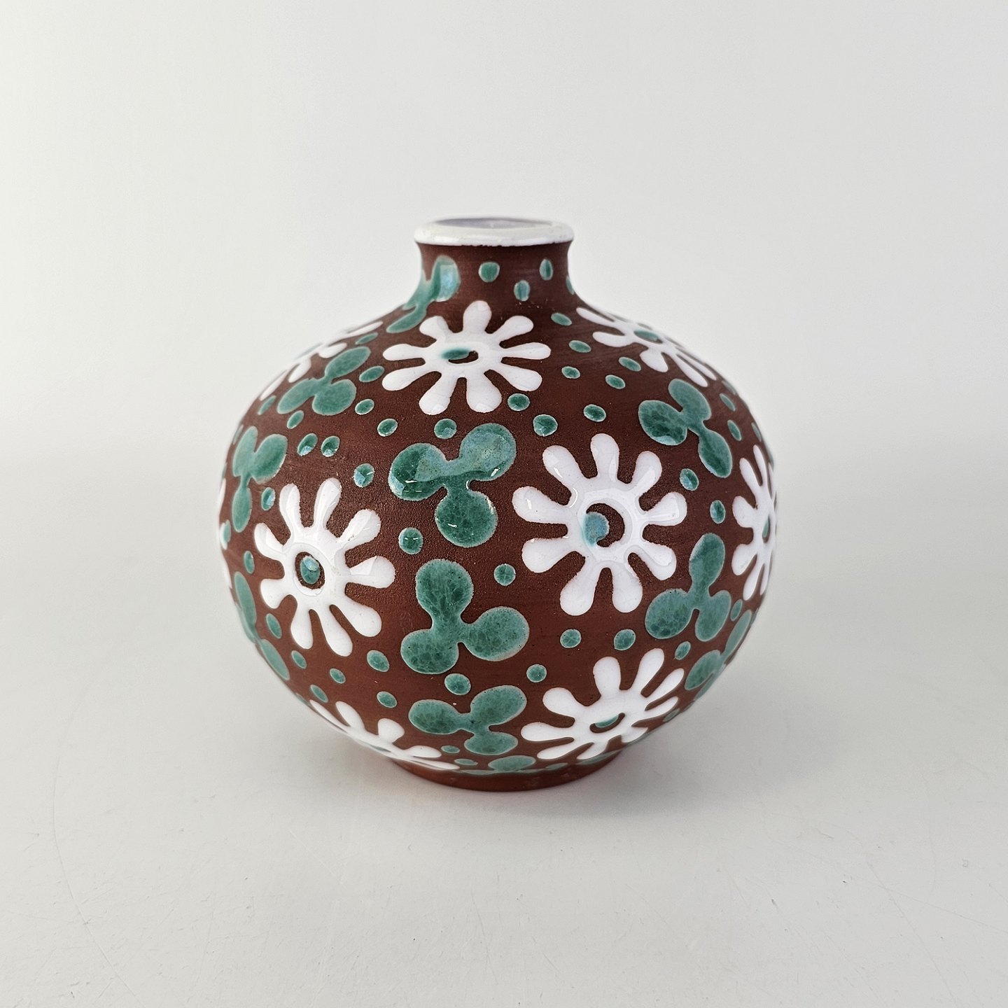 Vase i keramik med brun glasur og dekoration af hvide blomster og blågrønne blade