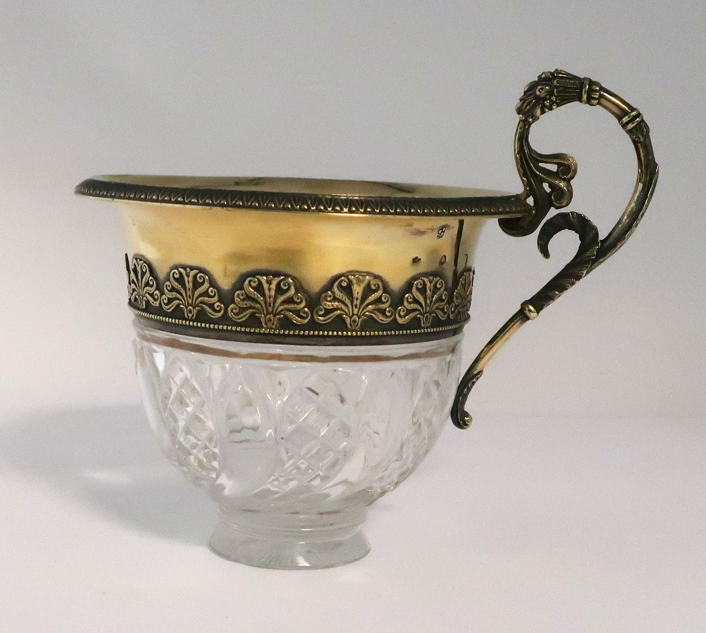 French crystal cup with silver gilt mounting. Cup and saucer. Height 13 cm. Minor edge chip on the underside of the cup.