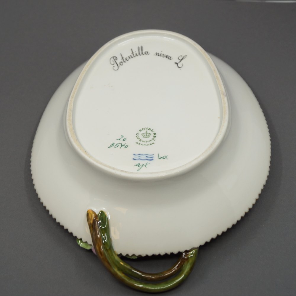 Royal Copenhagen, Flora Danica porcelain; Dish/bowl #3540. Decoration: Potentilla nivea L. Decorated in colours and gold with flowers. L. 22 cm. W. 17 cm.