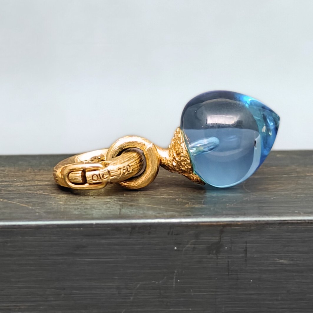 Ole Lynggaard; Sweet drop charm to put on bracelets or necklaces. in 18k gold, with blue topaz. Can be opened, so it can also be put on a pearl or stone chain.
