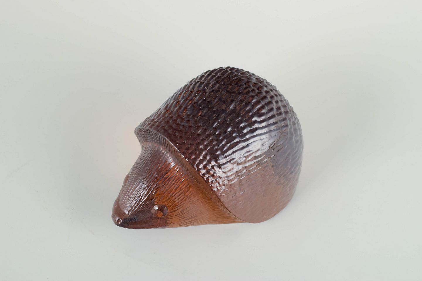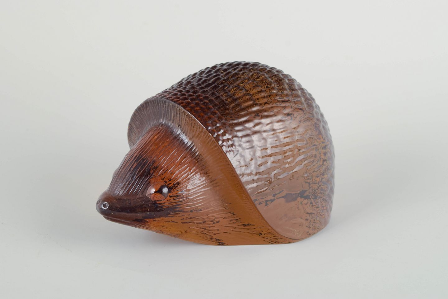 Hand-cast art glass figure of a hedgehog in warm amber glass with softly textured matte back and smooth polished front, produced in collaboration with the World Wildlife Fund. Naturalistic yet stylised form language.