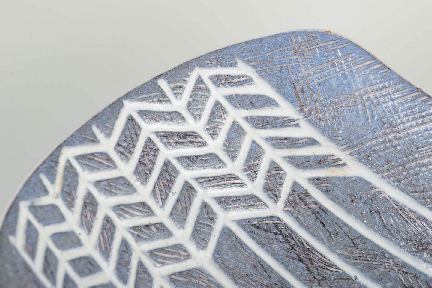 Organic form with concave sides and grey-blue incised geometric decoration.