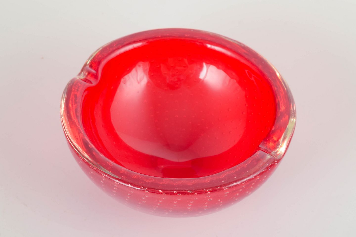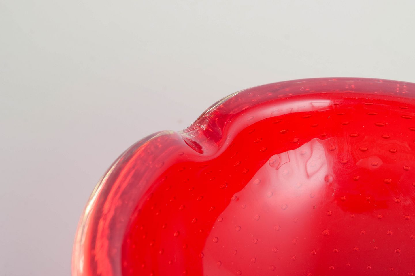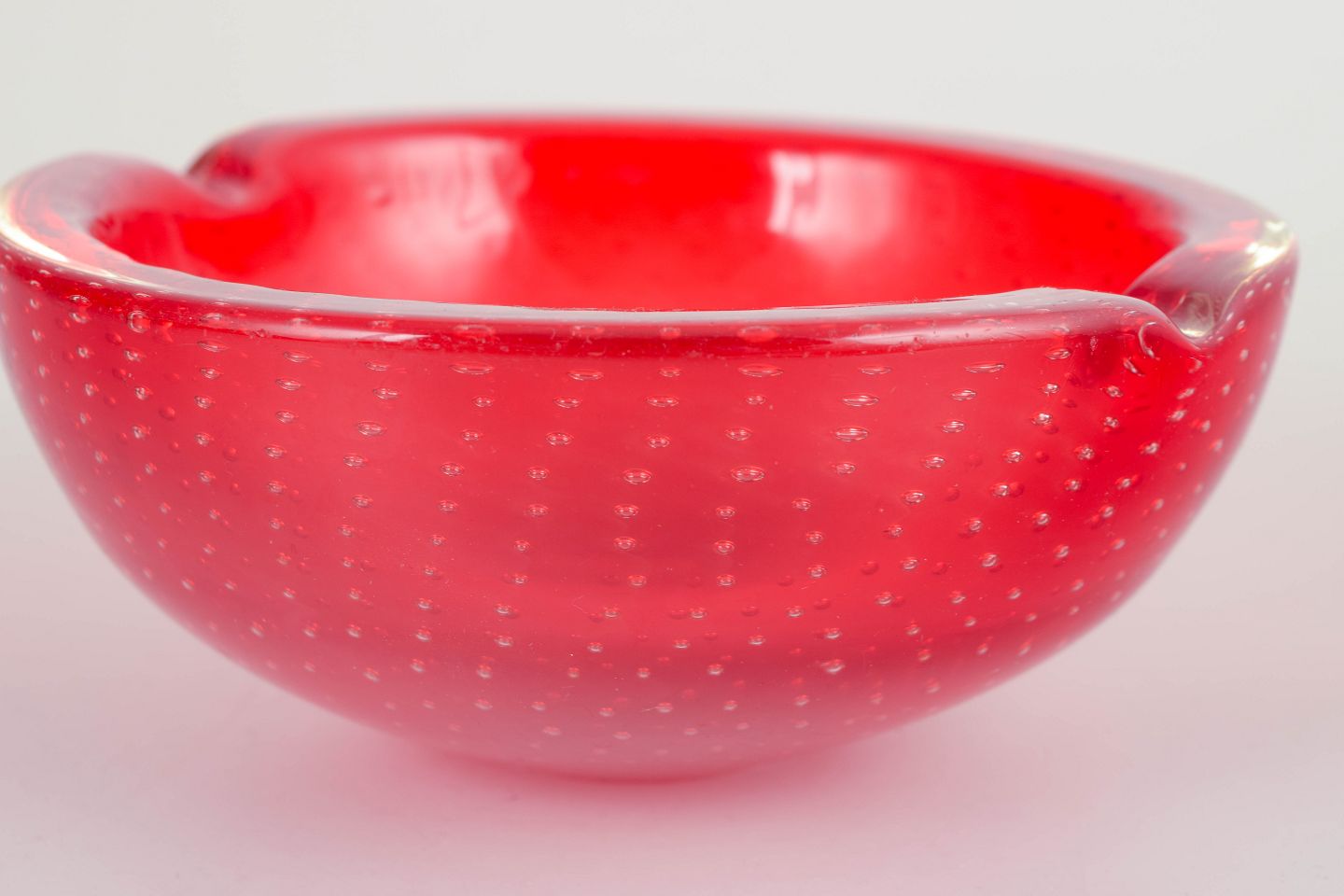 Organic freeform hand-blown bowl in red sommerso glass with trapped air-bubble pattern (bullicante), typical of Italian Murano glass production.