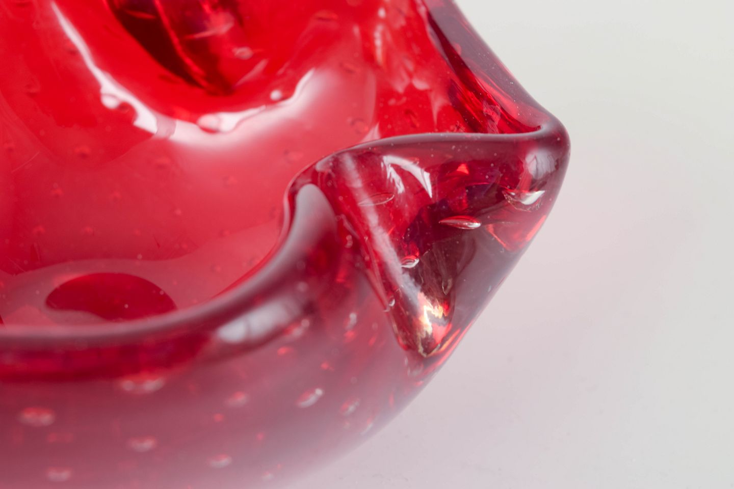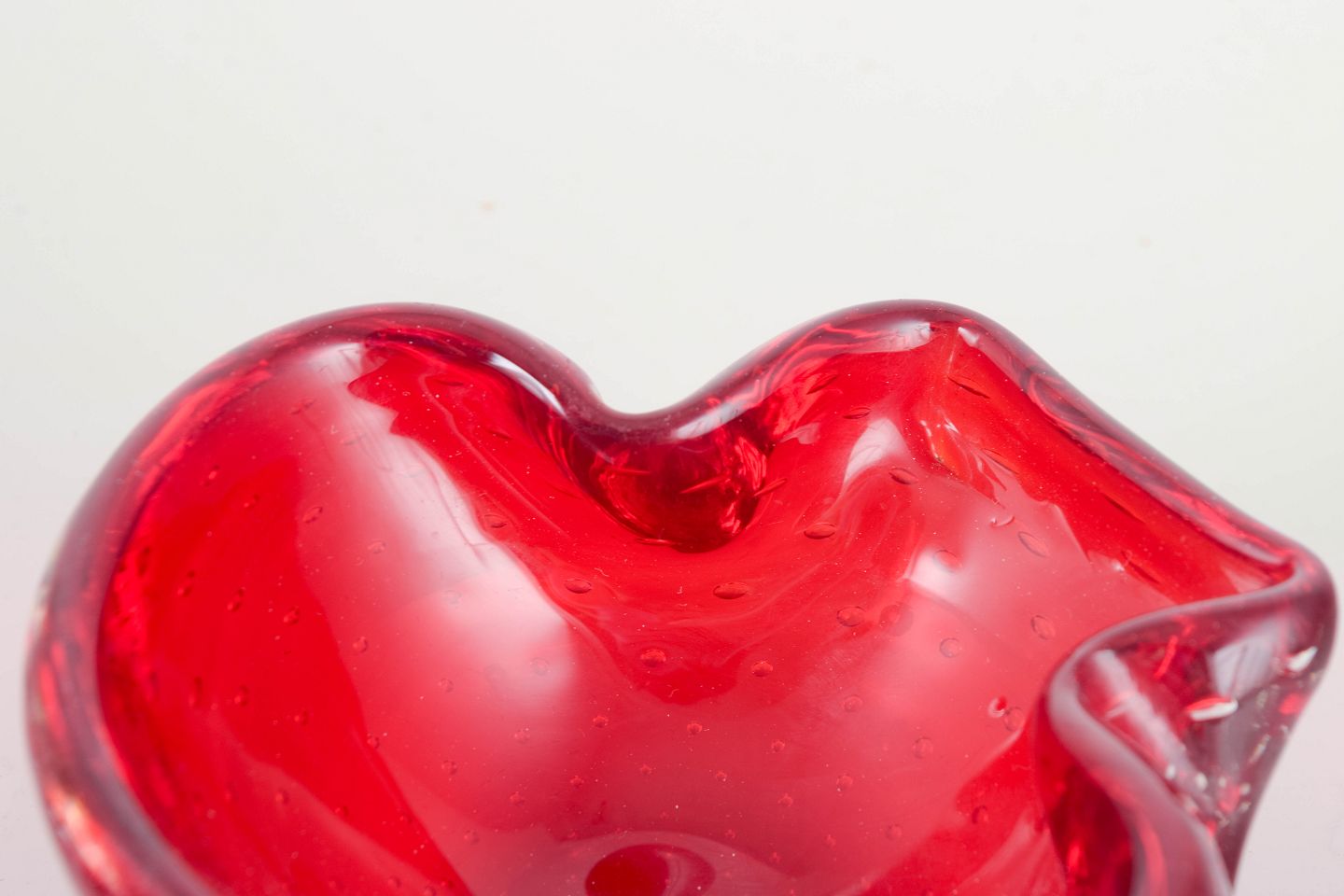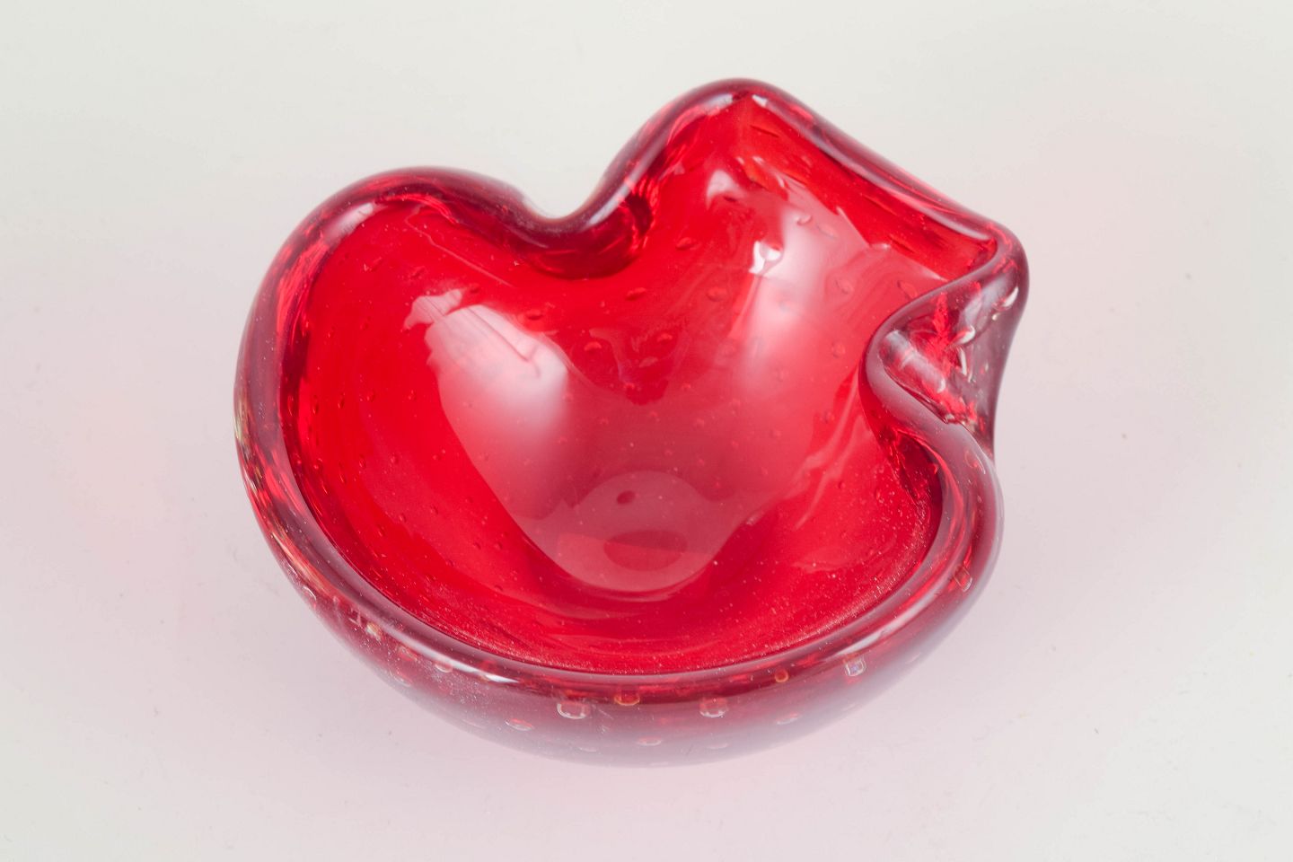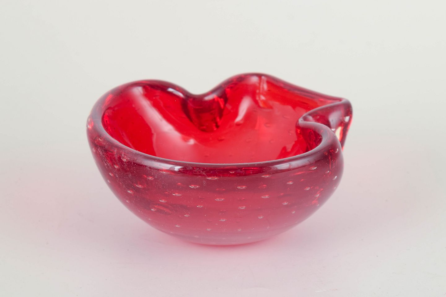 Organic freeform hand-blown bowl in red sommerso glass with trapped air-bubble pattern (bullicante), typical of Italian Murano glass production.