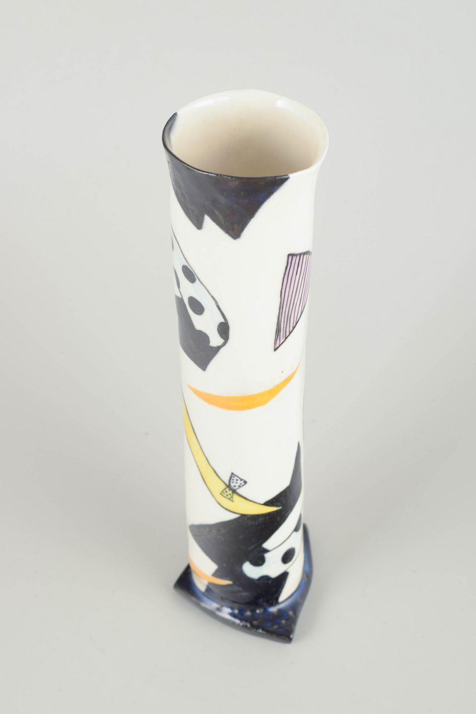 Handmade triangular studio vase in white-glazed stoneware with graphic, Memphis-inspired decoration in blue, yellow and black tones.