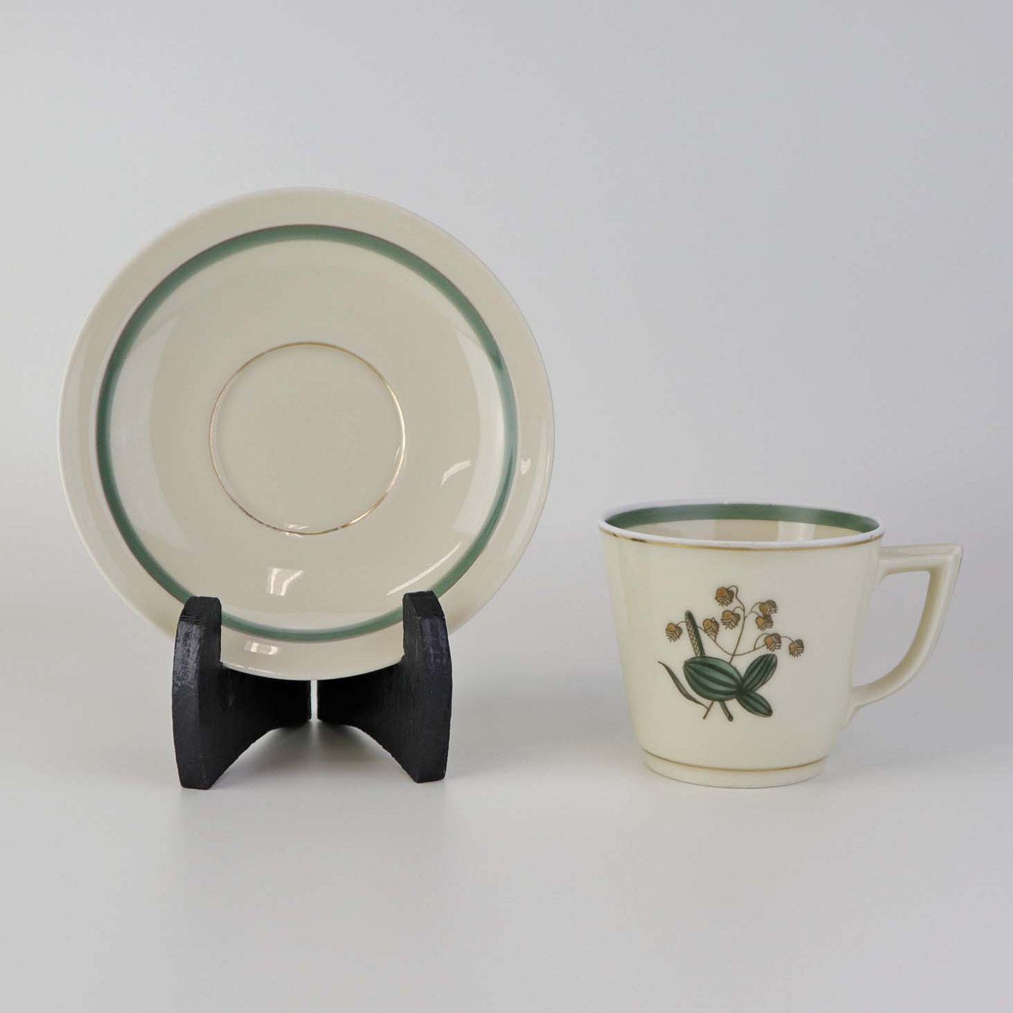 Stel i glat råhvidt porcelæn dekoreret med lysegrøn stribe og guldkant samt motiv af hjertegræs.