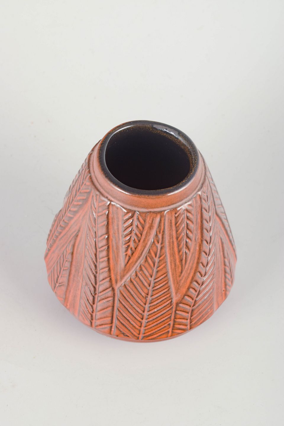 Conical stoneware vase with deep-relief leaf decoration and warm reddish-brown glaze. Dark glaze interior. Model 4583.