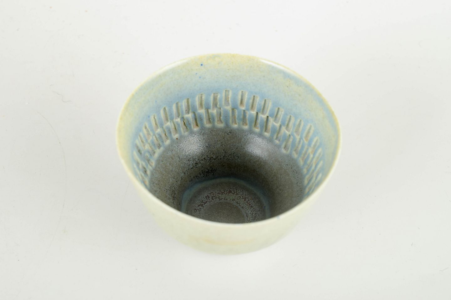 Unique hand-thrown studio bowl in stoneware with an experimental test glaze in soft blue-green tones featuring subtle interior colour gradation and decorative vertical glaze accents. Unsigned.