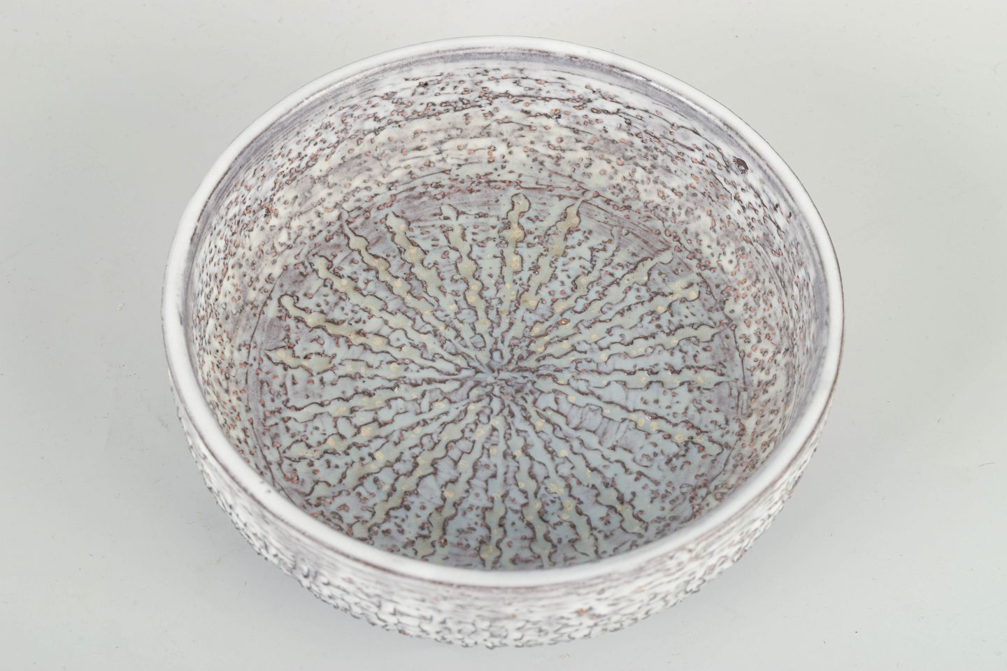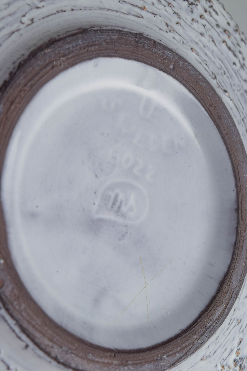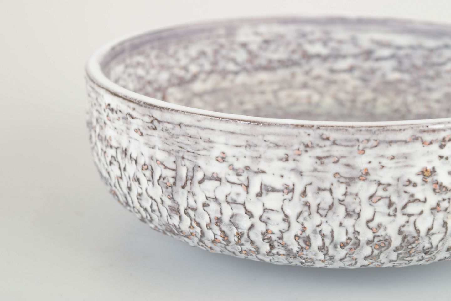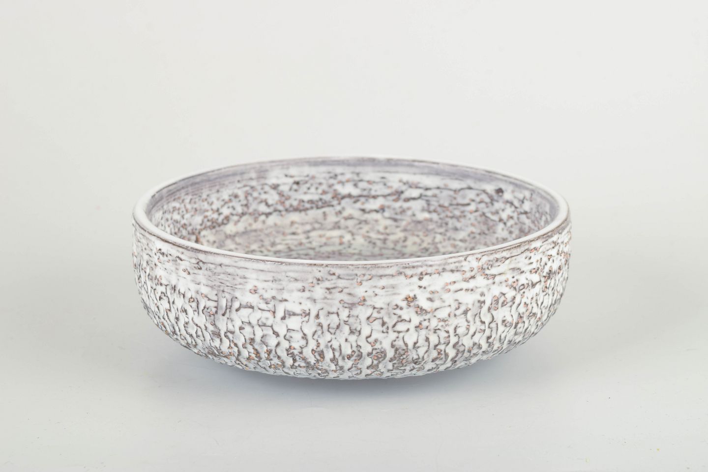 Low circular stoneware bowl with characteristic white-grey chamotte glaze and organically textured surface — typical of Simmulson’s 1960s exploration of tactile ceramic expression.