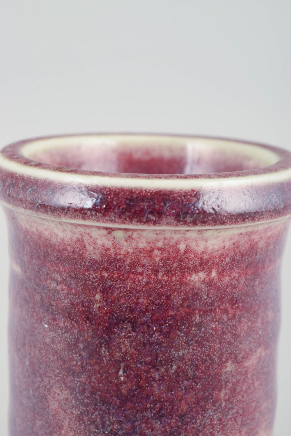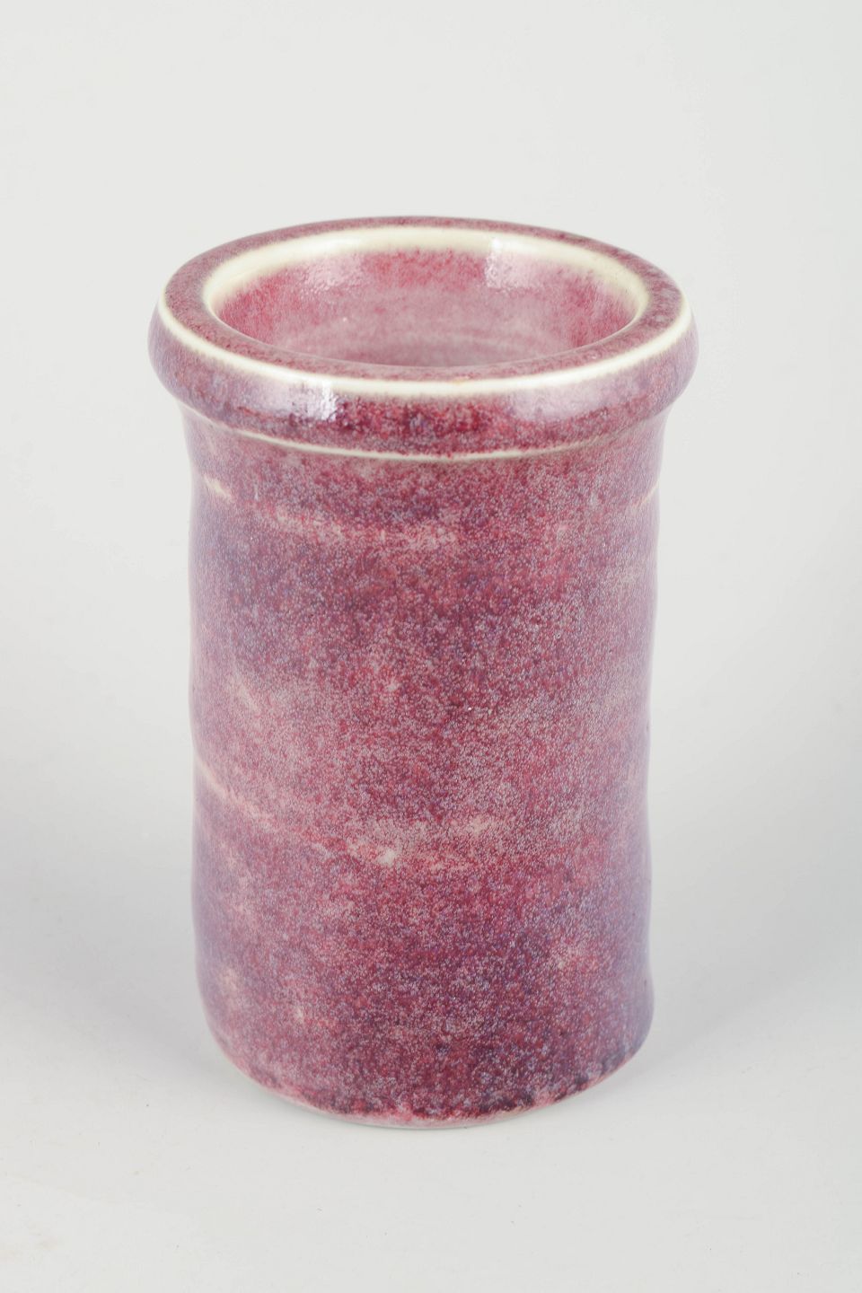 Cylindrical studio vase in thrown stoneware with an experimental pink-purple test glaze and light rim detail, signed with monogram to the base.