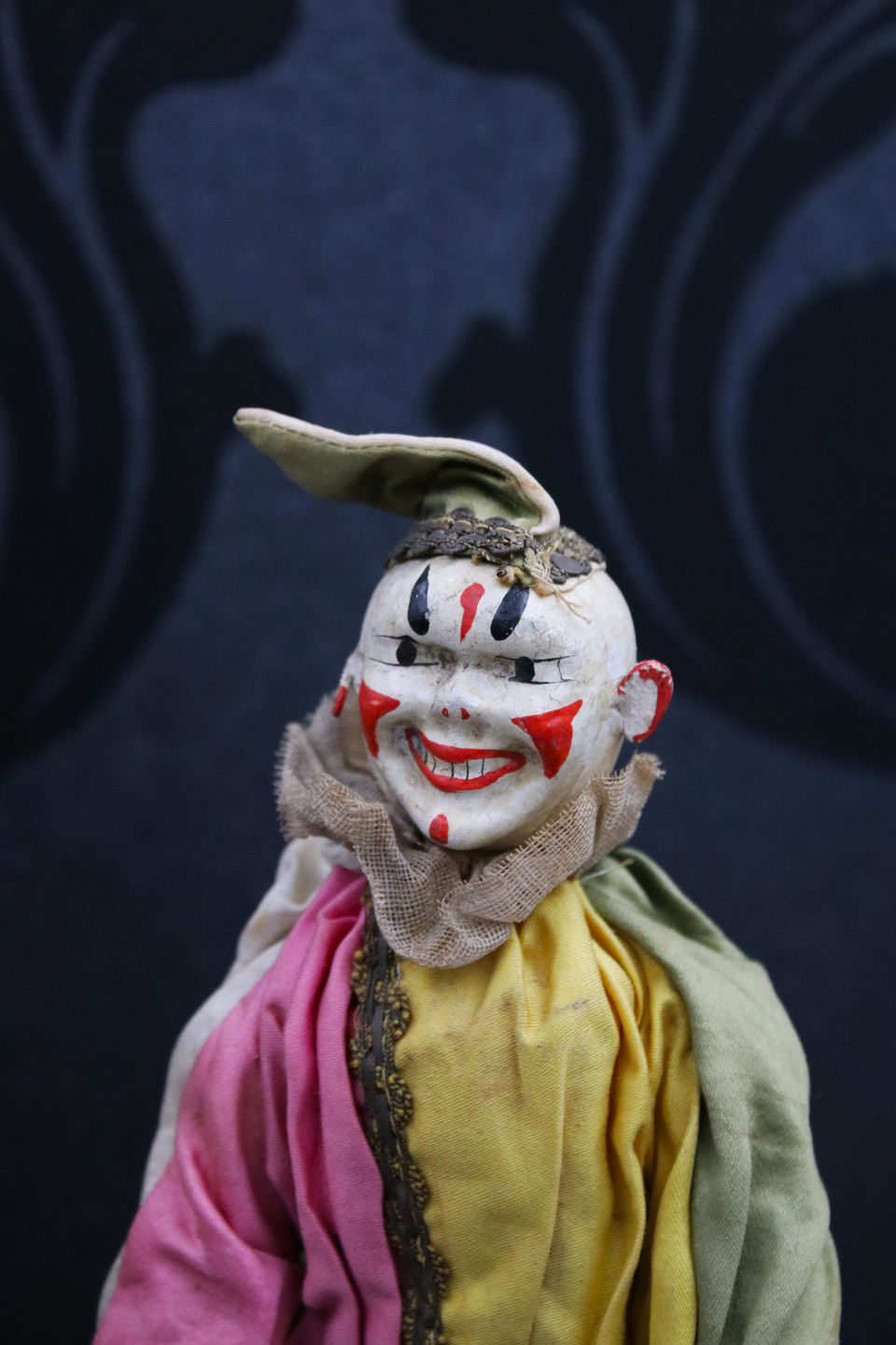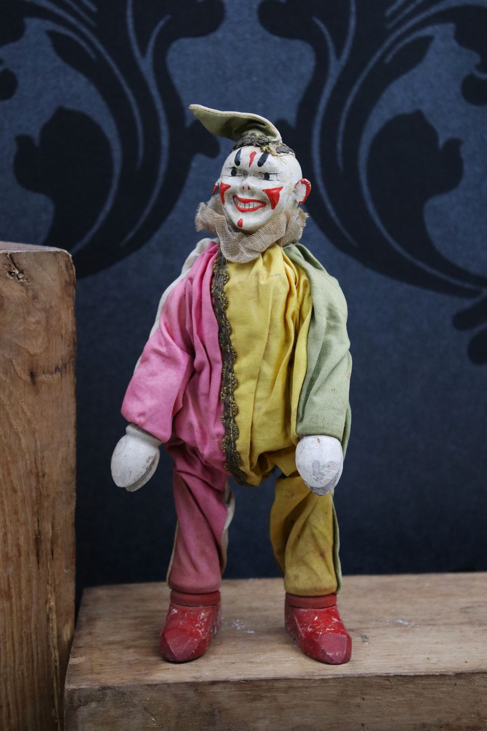 Decorative, fun circus clown from around 1910 in carved wood with painted face and fine clown costume in fabric.