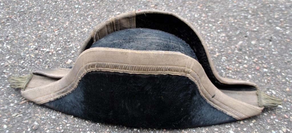 Antique "Sause Pot", Triangular hat, Border gendarme. 19th century. Denmark. Manufacturer: Royal Court hat manufacturer AF Bodecker, Frederiksbergsgade, Copenhagen. Stamped inside. L.: 43 cm. H.: 13.5 cm.