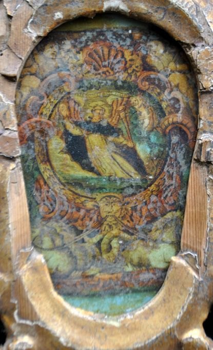 Lamp arm missing. Mirror replaced with glass with hand-colored copper engraving.