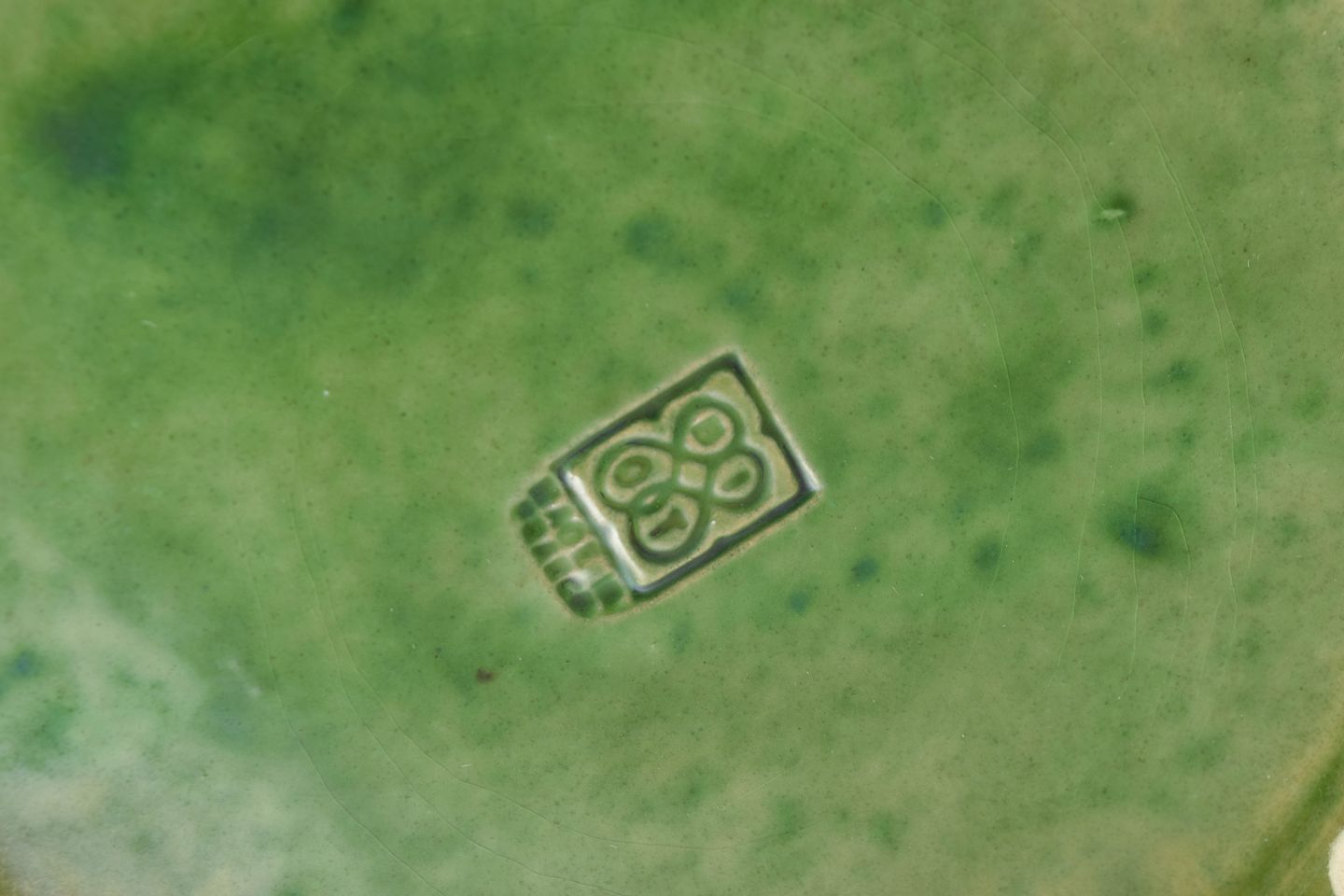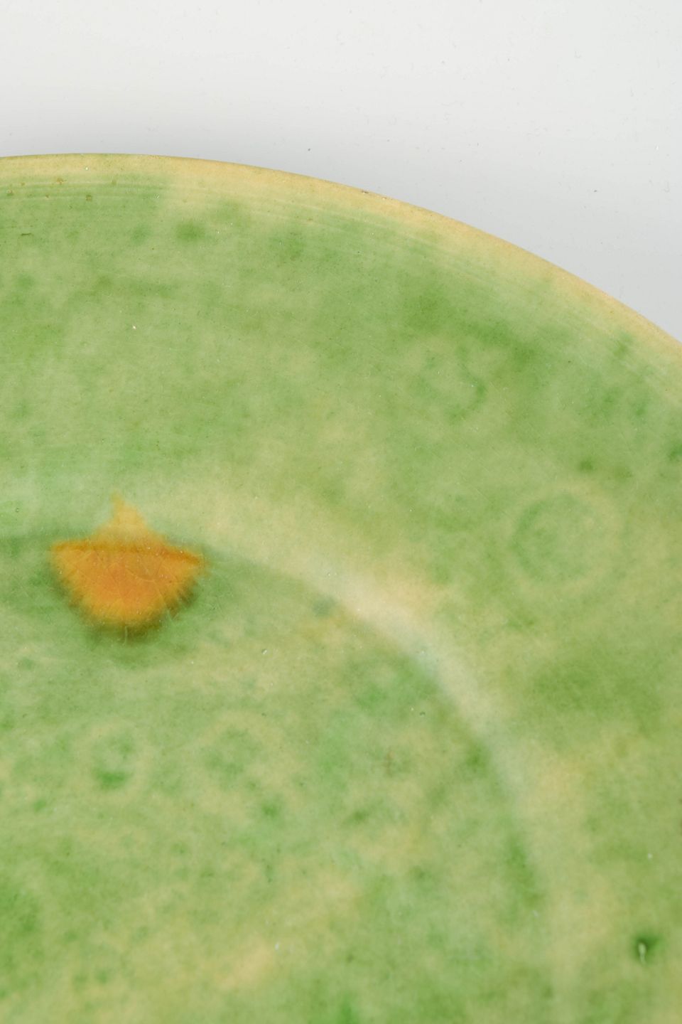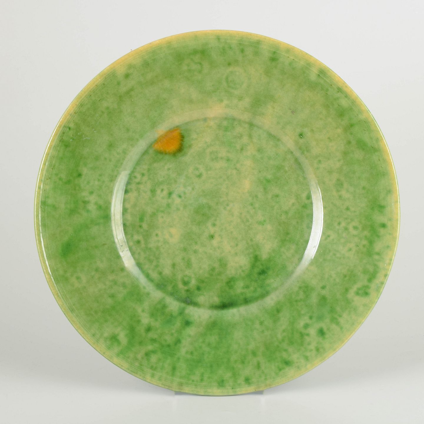 Handmade stoneware dish with vivid green glaze featuring yellow nuances and a small firing mark. Typical of the Biot studio tradition in southern France, known for rustic forms and natural glaze effects.
