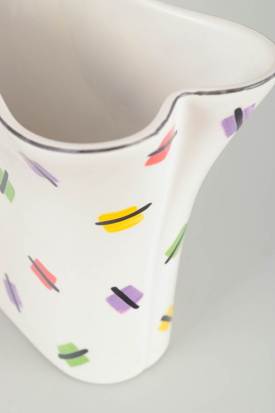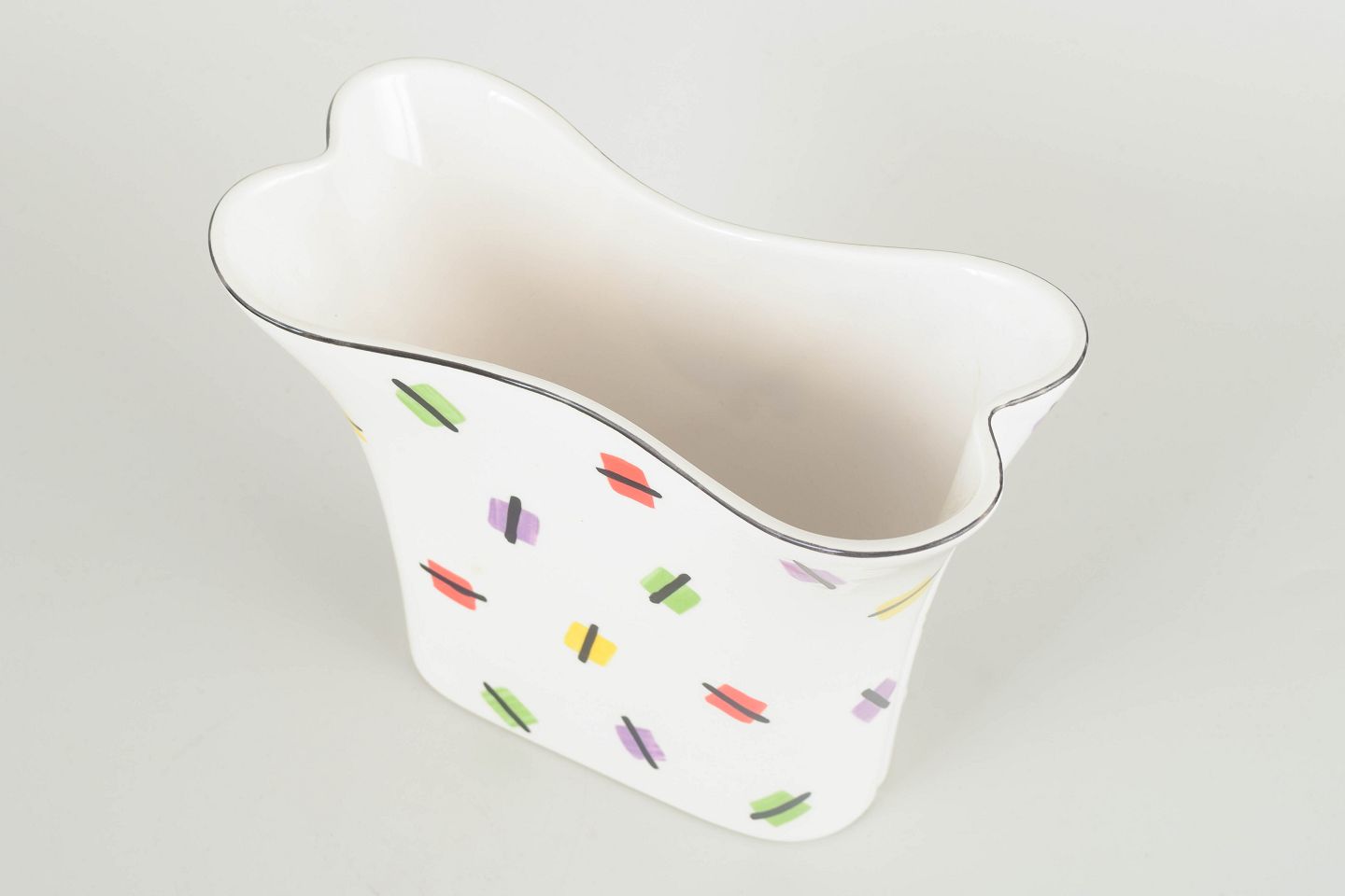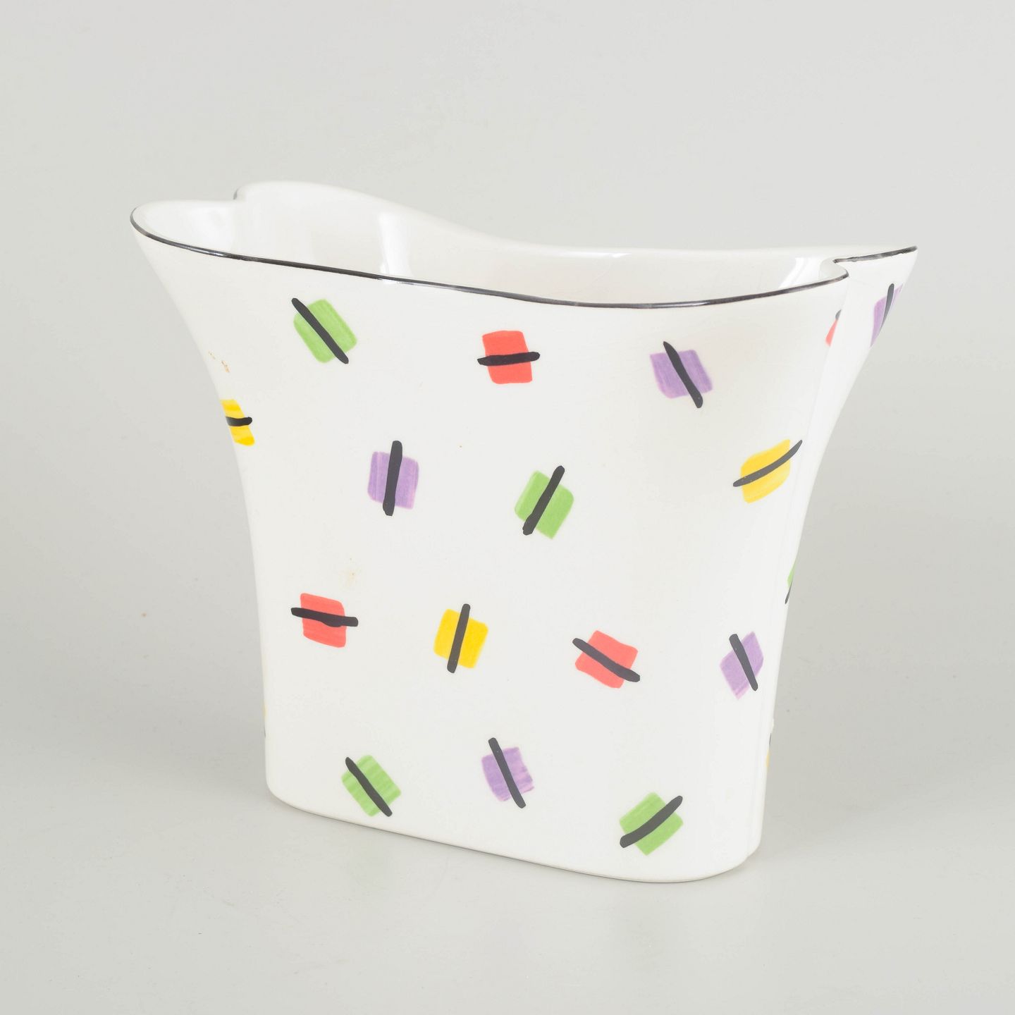 Faience vase in distinctive Memphis style with an undulating form and hand-painted decoration in bright colours – green, purple, yellow and red – on a white background with a black rim. A lively and playful example of Rönndahl’s design for Gustavsberg in the 1980s.