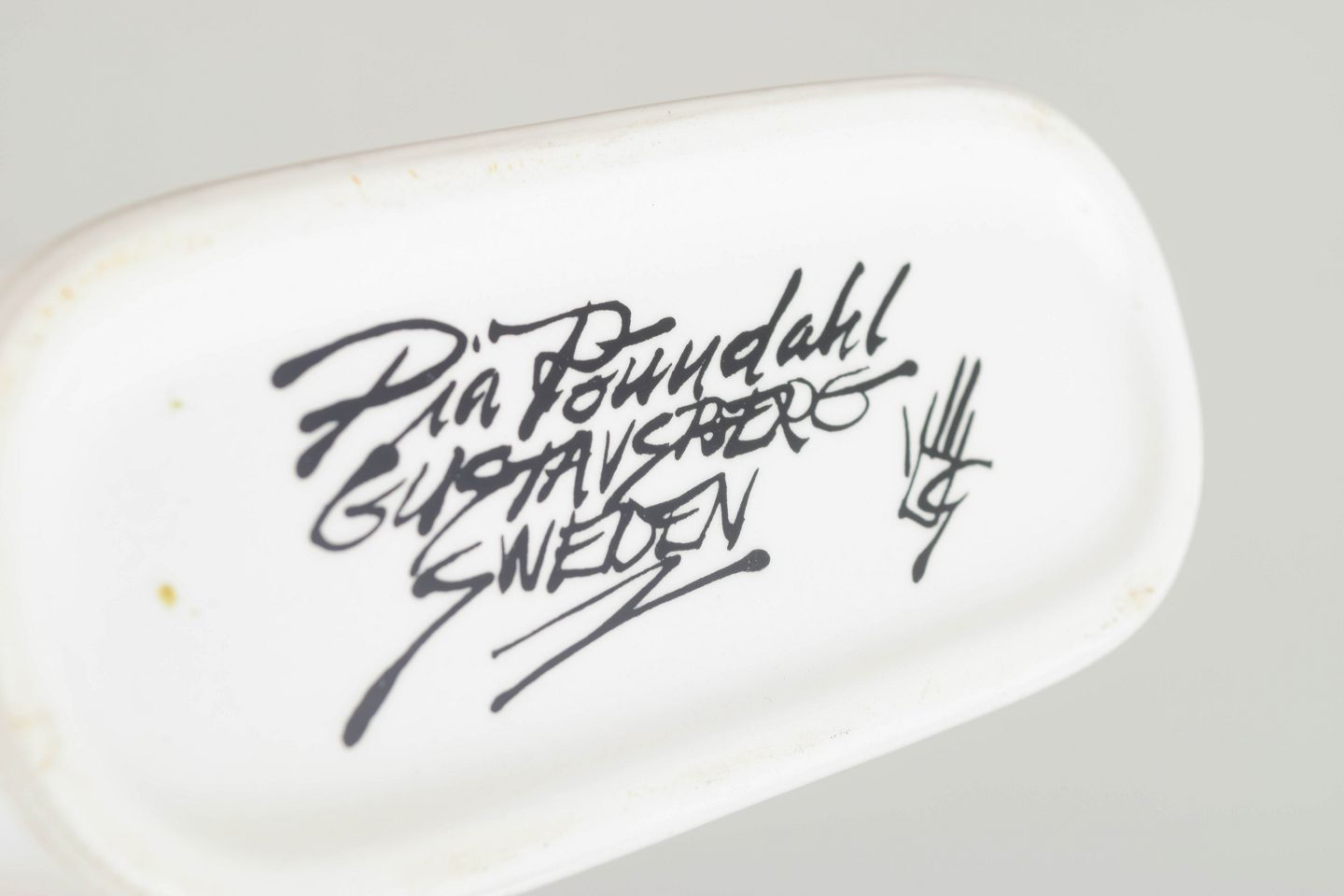Pia Rönndahl (b. 1954) is a Swedish ceramic artist and designer educated at Konstfack. She worked for Gustavsberg from 1981 to 1989, creating a range of colourful, geometric decorations inspired by the Memphis movement. Her works blend humour, postmodern aesthetics, and traditional Swedish faience craftsmanship.