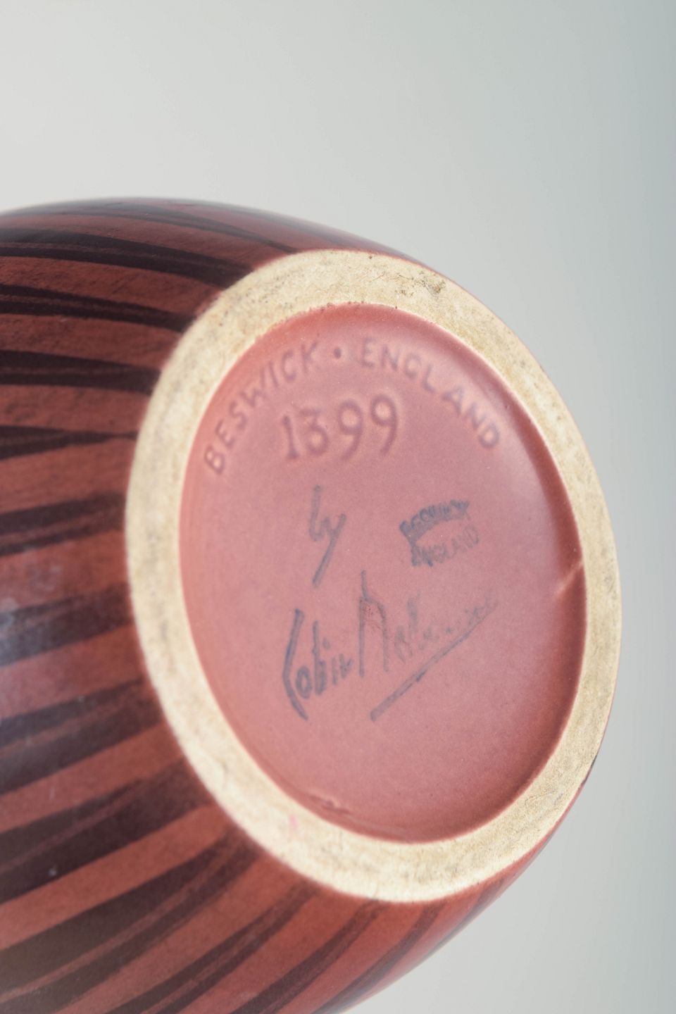Elegant and distinctive vase in reddish and brown clay tones with hand-decorated vertical pattern and organically shaped rim. Underside marked Beswick England 1399 and signed by Colin Melbourne.
