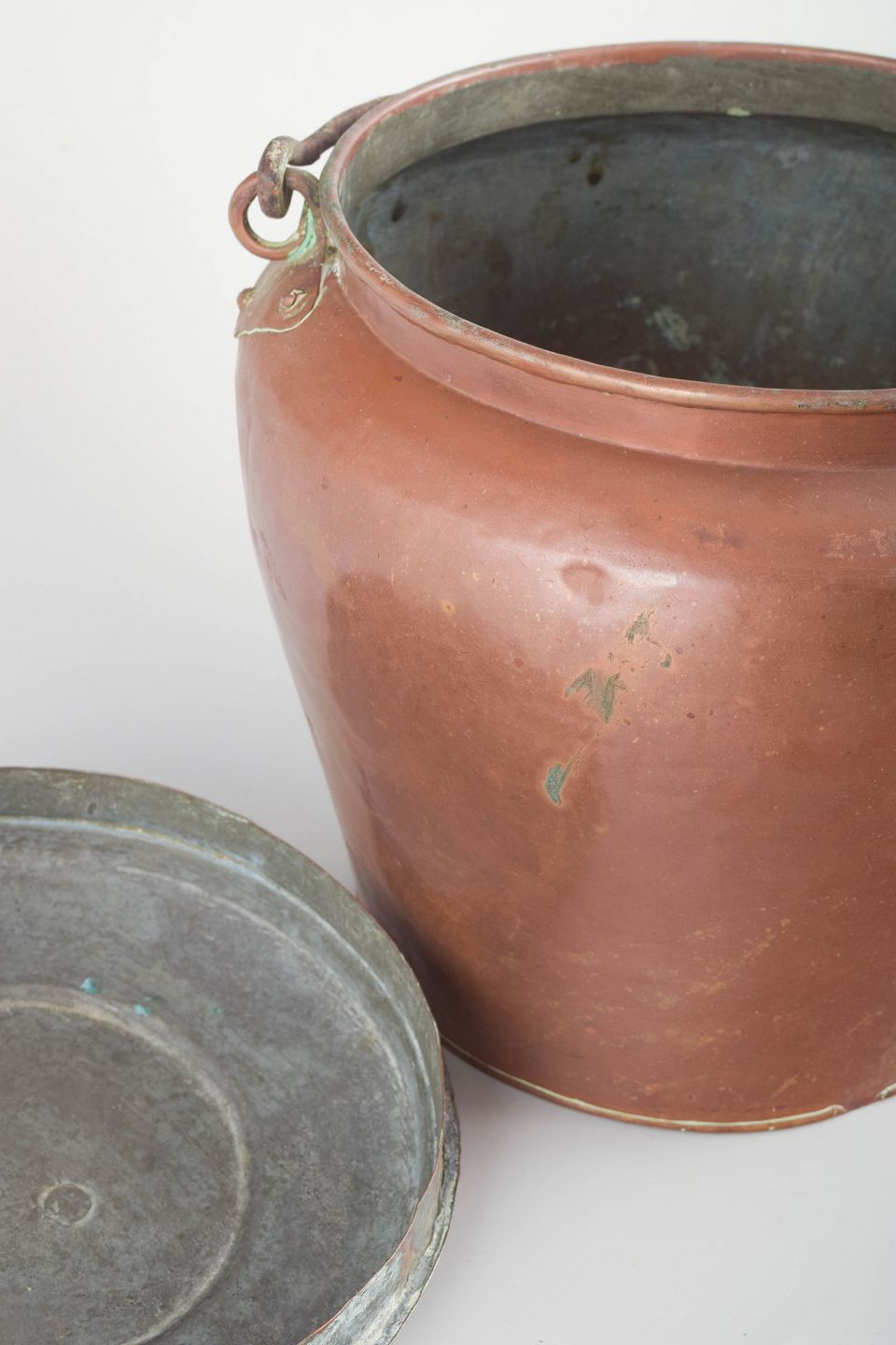 Copper maternity pail with lid and curved handle.