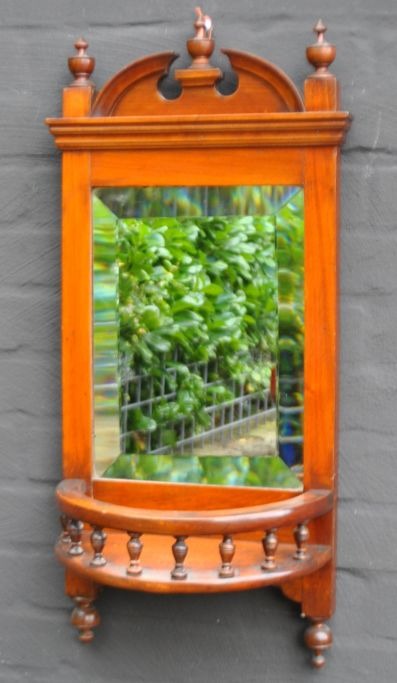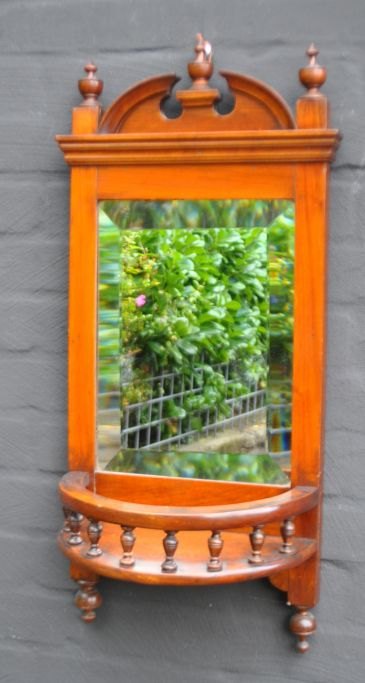 English wall mirror in mahogany with shelf, 19th century. Semi-circular shelf with turned columns. Top with turned knobs. With faceted mirror. H; 65 cm. W.: 28 cm.