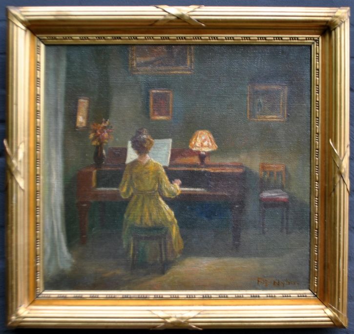 Friis Nybo, Poul (1869 - 1929) Denmark: Woman playing piano. Oil on canvas. Signed. 49 x 52 cm.