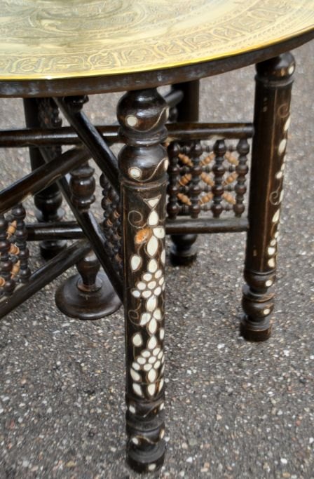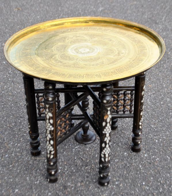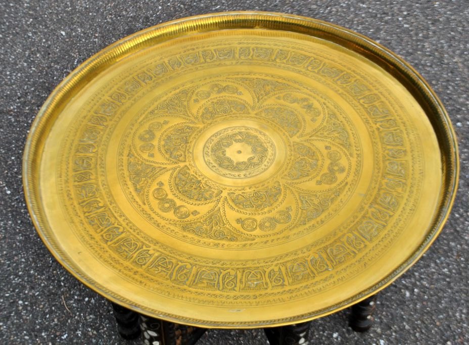 Arabic smoking table with brass plate, 19th/20th century. Brass plate decorated with patterns. Wooden base with inlaid mother of pearl. H.: 49 cm. Dia.: 59 cm.