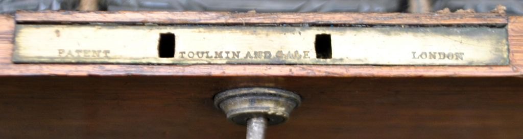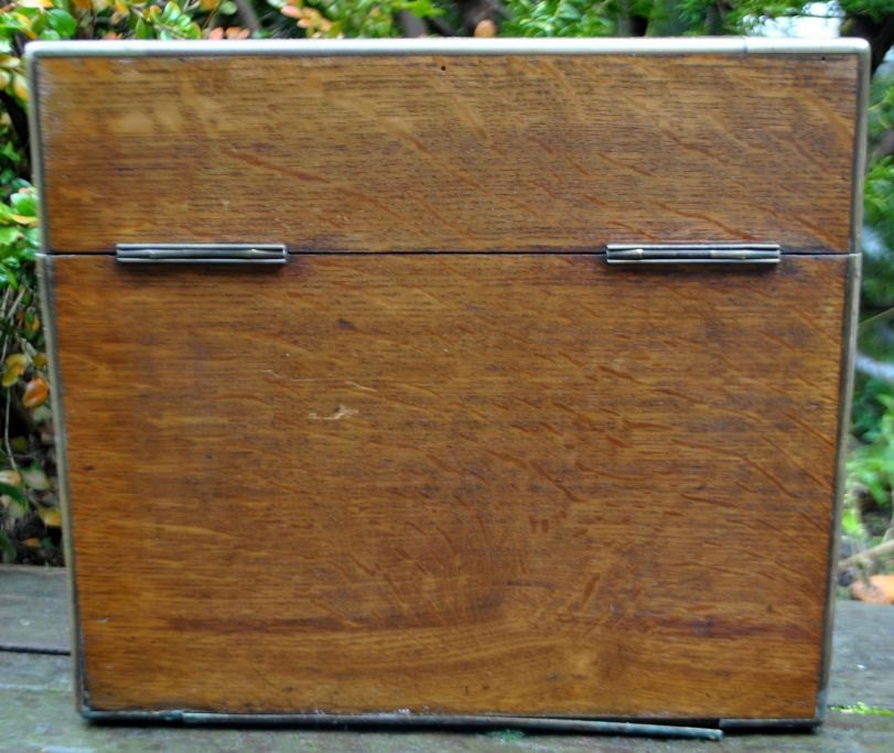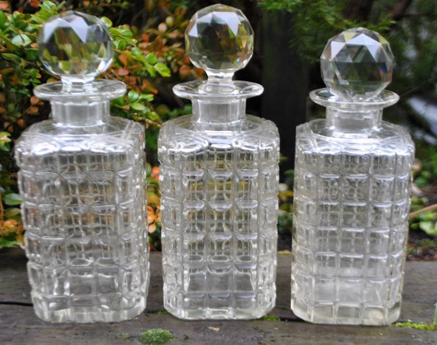 English tantalus with three crystal decanters, 19th century. Polished oak box with lock and key plate. Containing three decanters with stopper. Stamped. H: 27 cm. L: 30 cm.