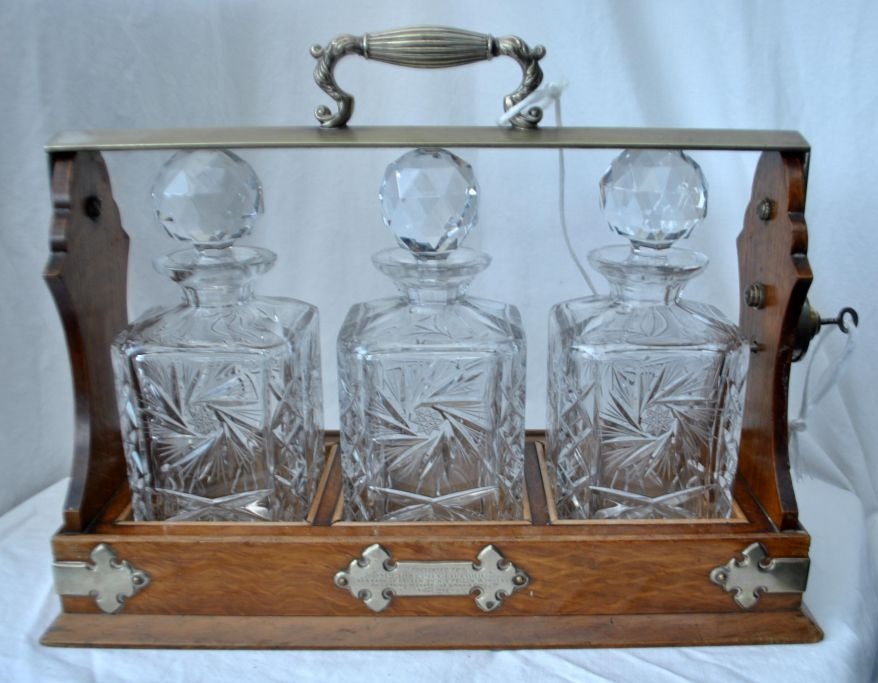 English tantalus with three decanters, 19th century. Polished oak. With silver-plated fittings and lock with key. H: 32 cm. L: 41 cm.