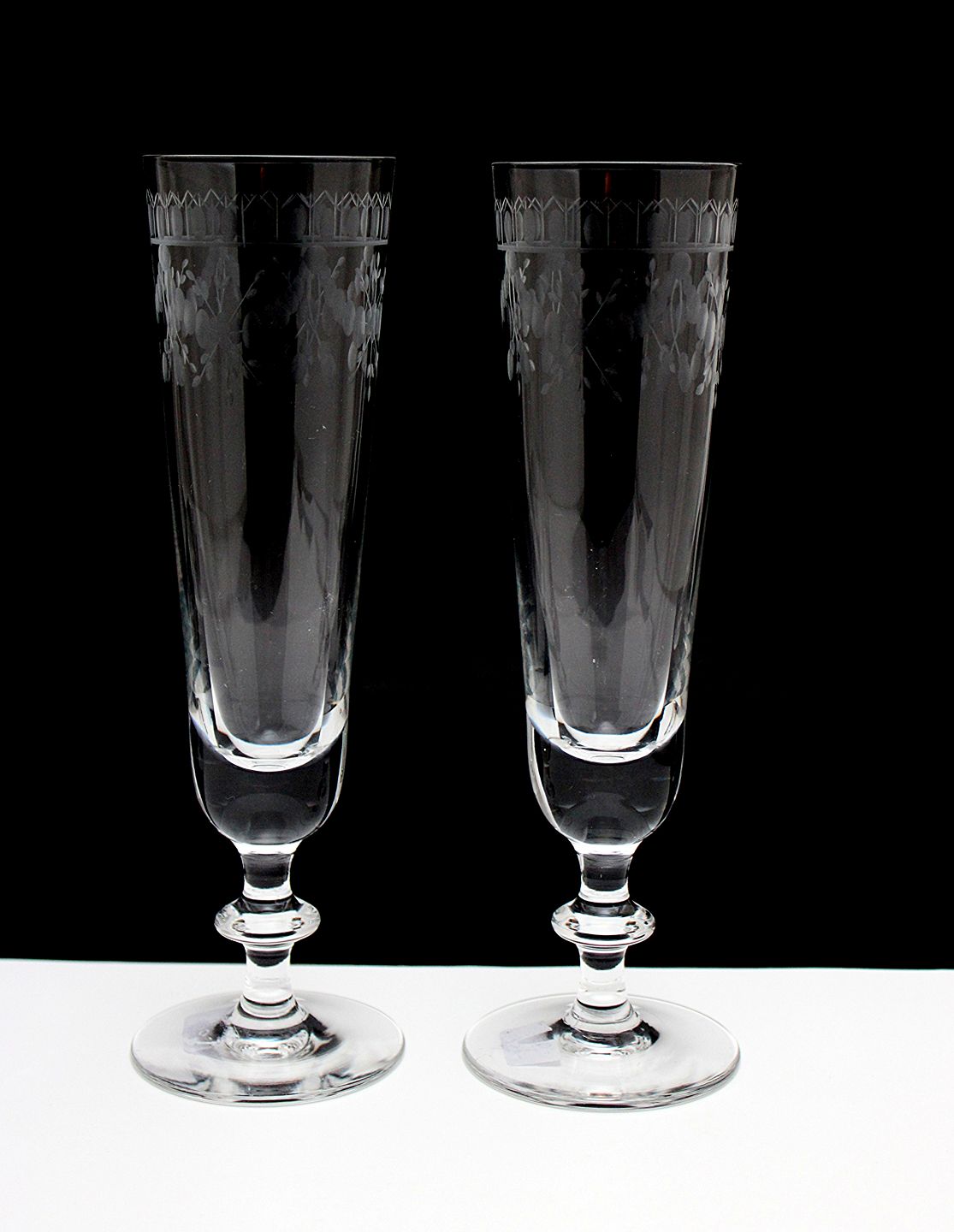 Krystal Champagnefløjter graveret med ranker og guirlande bånd. Højde 19,5 cm. Diameter øverst 5,2 cm. Pris samlet 2 stk: 300 kr.